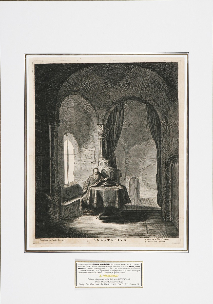 VAN BAILLIU PIETER (1613 - 1660) S Anastasio. Acquaforte. Cm 25,5x31. Incisione calcografica all’acquaforte tratta da un disegno di Rembrandt ed edito da C. Danckertz - Anversa metà del XVII° sec. - Dim. della stampa con piccolo margine L. 25,5 x 31 cm. (dim. della sola parte incisa senza le lettere L. 23,6 x 28,7 cm.).Bibliogr.: ZANI, III, 44 e varie - LE BLANC, I, 131-132 - GORI G., I, 35 - FERRARIO, 23 - E. BENEZIT, I, 381 (Ed. del 1976).