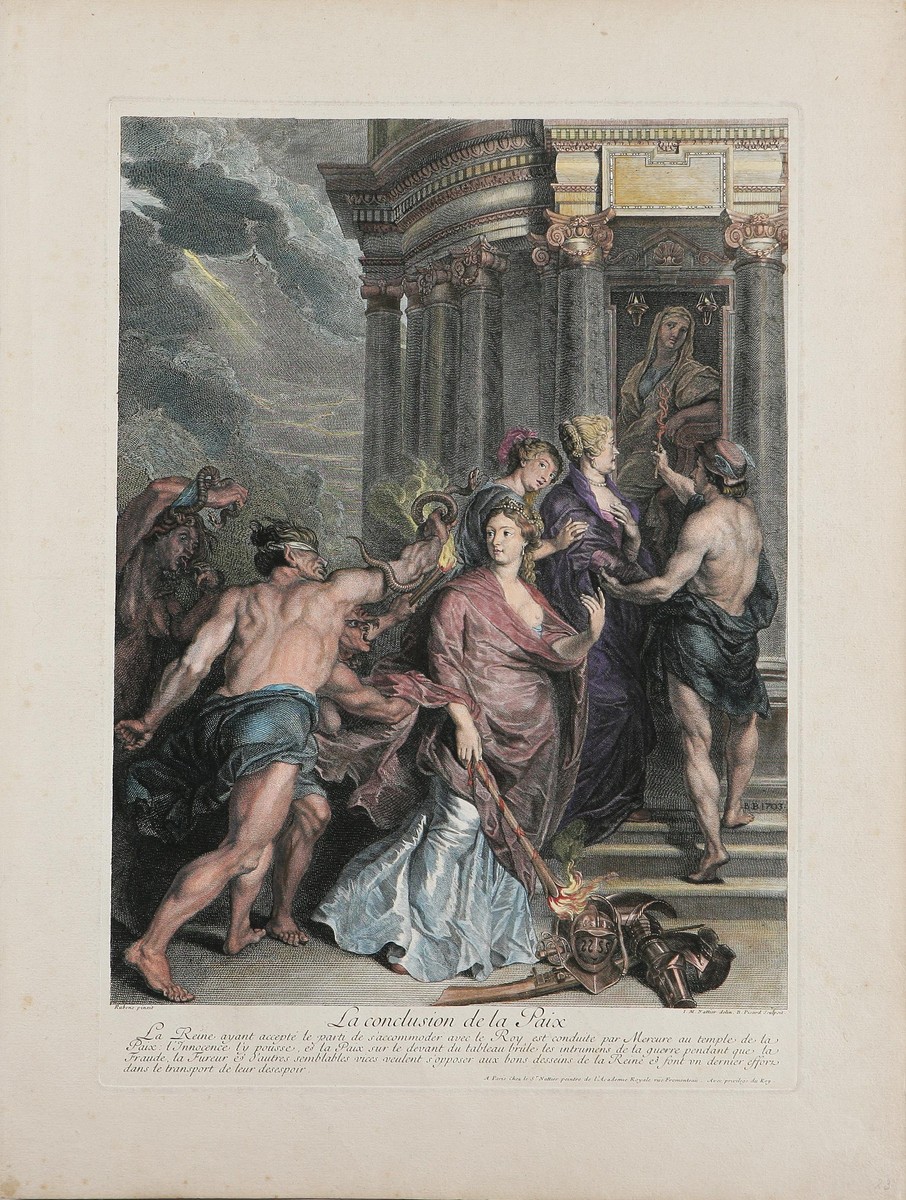 PICART BERNARD (1673 - 1733) La conclusione della pace. 1709. Acquaforte e bulino. Cm 45,8x61. Incisione all’acquaforte e bulino con acquerellatura non coeva. tratta da un dipinto di Rubens su disegno di I.B. Nattier (appartenente alla raccolta dei dipinti di Rubens de “La Galerie du Luxemburg”) - Parigi 1709 - Dim. della stampa con ampi margini: L. 45,8 x 61 cm. (dim. della sola parte incisa senza le lettere L. 34,2 x 45,2 cm.).Bibliogr.: MILESI, 254 - GORI G., III, 44-48 - LE BLANC, III, 190-196 - ZANI, XV, 111 e varie - TICOZZI, III, 140-141.