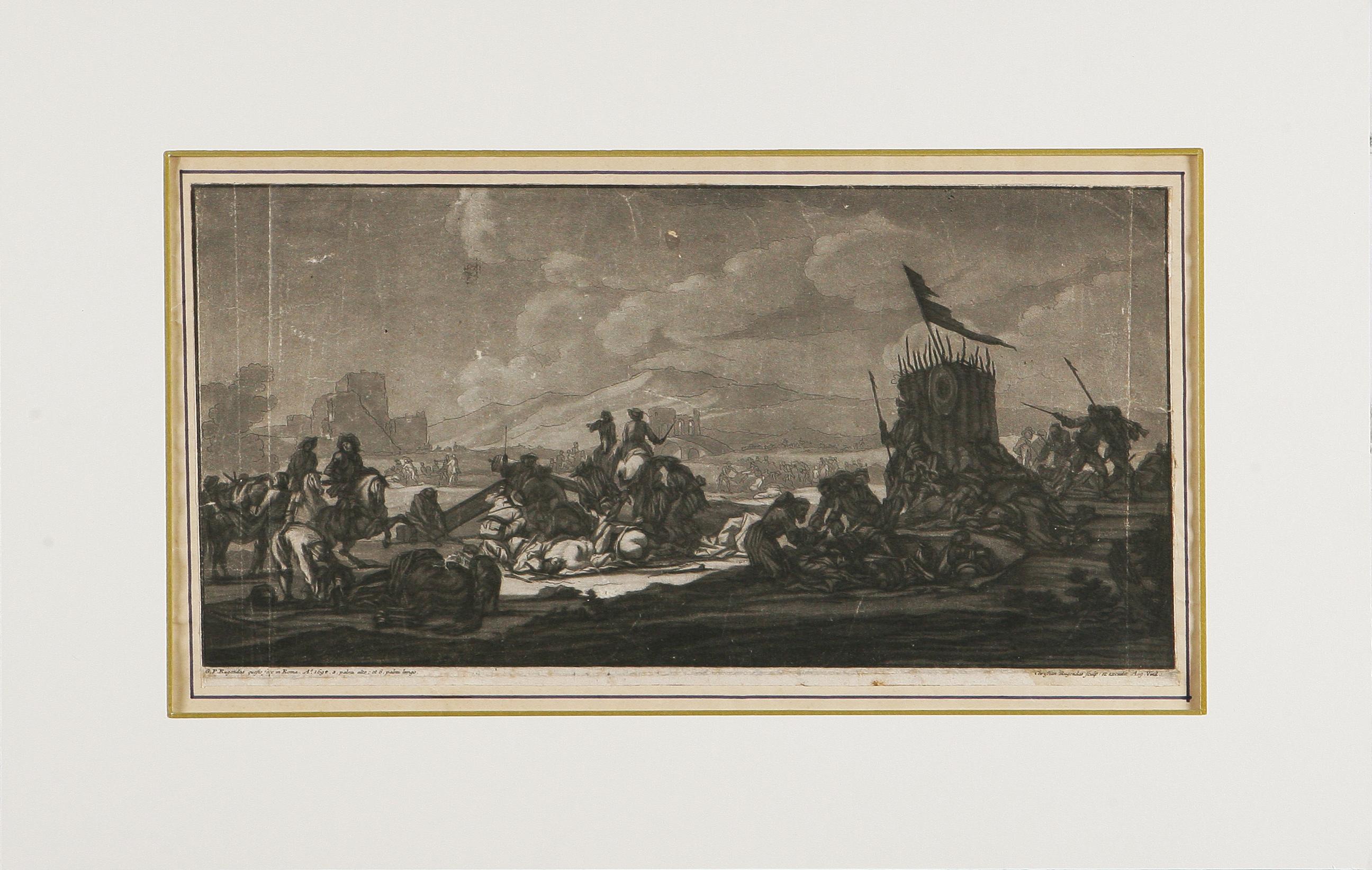RUGENDAS JOHANN CHRISTIAN (1708 - 1781) Retrovie del campo di battaglia. 1740. Acquatinta. Cm 40x20,7. Incisione calcografica all’acquatinta grigia contro-fondata tratta da un dipinto di G.P. Rugendas realizzato a Roma nel 1694 - Ausbourg 1740 ca. - Dim. della stampa rifilata all’inciso L. 40 x 20,7 cm. compreso piccolo margine con le scritte.Bibliogr.: BENEZIT, IX, 171 (Ediz. del 1976) - BRYAN'S, IV, 297 - MILESI.Incisione calcografica all’acquatinta grigia contro-fondata tratta da un dipinto di G.P. Rugendas realizzato a Roma nel 1694 - Ausbourg 1740 ca. - Dim. della stampa rifilata all’inciso L. 40 x 20,7 cm. compreso piccolo margine con le scritte.Bibliogr.: BENEZIT, IX, 171 (Ediz. del 1976) - BRYAN'S, IV, 297 - MILESI.
