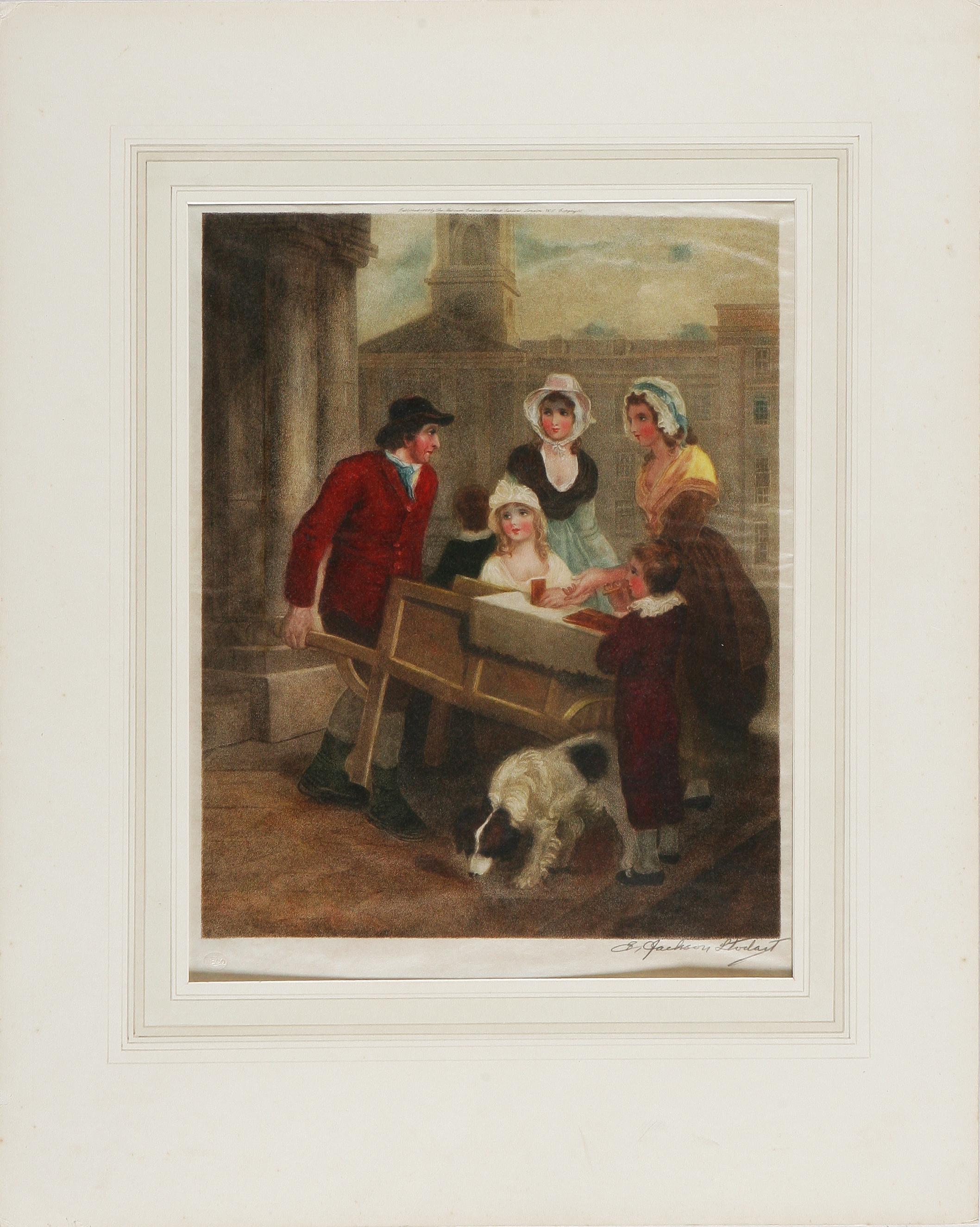 STODART EDWARD JACKSON (1879 - 1934) I gridi di Londra - Il venditore di pan di zenzero. 1928. Incisione. Cm 37,5x48. Incisione puntinata a colori stampata su carta pergamena, firmata a matita dall’autore e numerata (Me 92), appartenente alla serie “THE CRIES OF LONDON” tratta dai dipinti originali di Francis Wheatly - Londra 1928 - Dim. del foglio con ampi margini L. 37,5 X 48 cm. (dim. della sola parte incisa L. 27,2 X 34,2 cm.).Bibliogr.: E. BENEZIT, IX, 841 (Ed. del 1976) - MILESI, 307