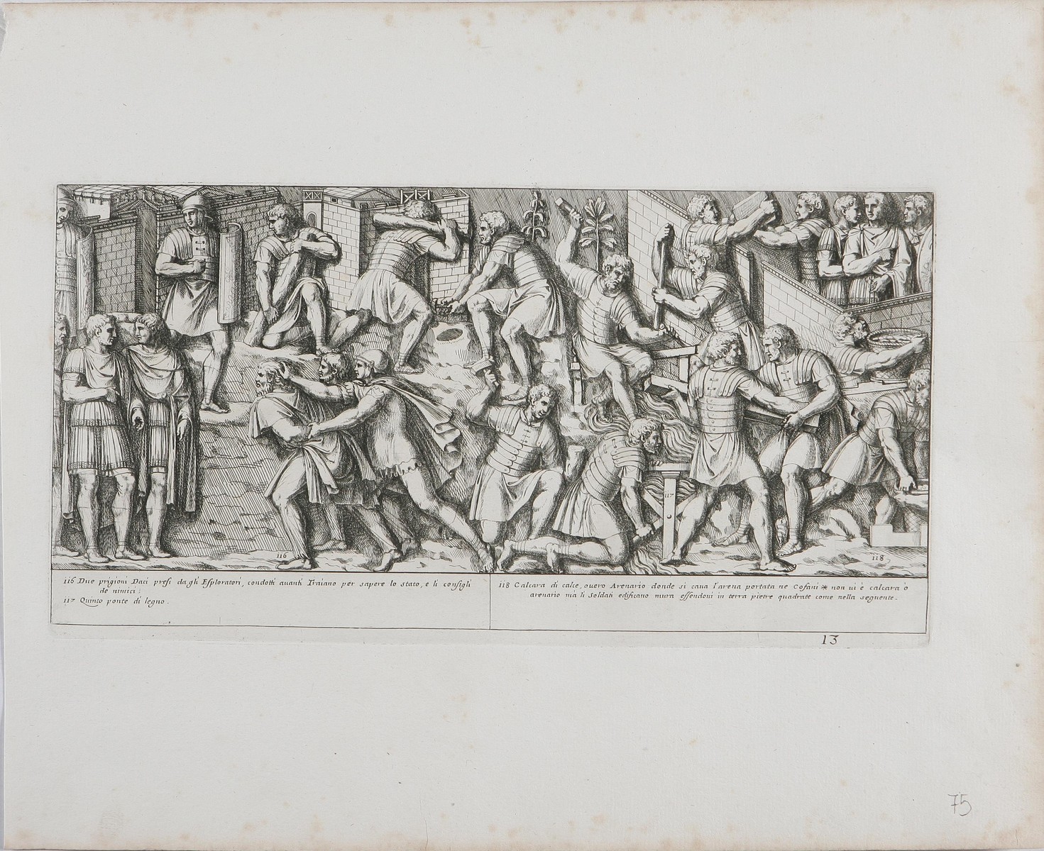 BARTOLI PIETRO SANTE (1635 - 1700) Soldati Daci catturati dagli esploratori Romani. Acquaforte. Cm 44,5x35. Incisione calcografica all'acquaforte, dim. dell'intero foglio con ampi margini L. 44,5 x 35 cm. (dim. della sola parte incisa senza le lettere: L. 36,3 x H. 16 cm.), appartenente alla serie delle sculture della Colonna Traiana (tav. 13) - Roma edizione primi ‘700.Bibliogr.: BRULLIOT, II, n° 2330; III, n° 1017, 1022, 1050 - NAGLER, I, 291 - HELLER, 33 - THIEME, II, pp. 555-56 - LE BLANC, I, 160-163 - GORI G., I, 58.