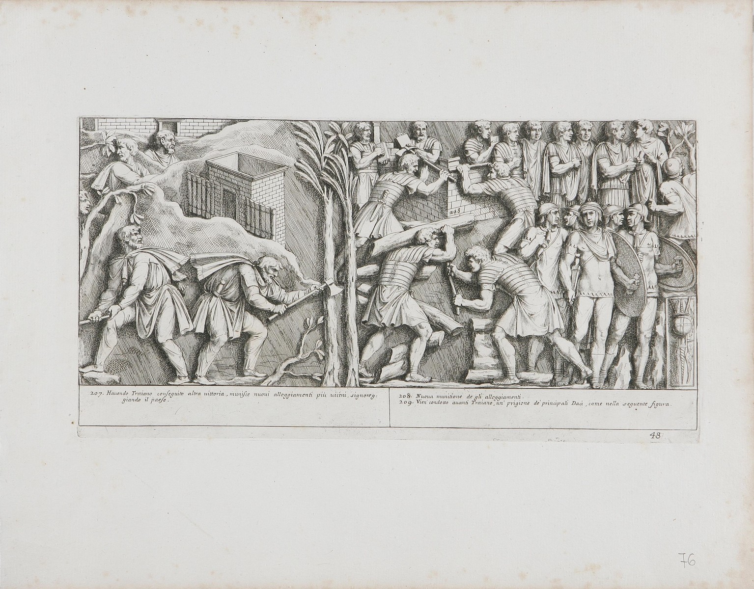 BARTOLI PIETRO SANTE (1635 - 1700) Nuova munizione degli alloggiamenti. Acquaforte. Cm 44,5x35. Incisione calcografica all'acquaforte, dim. dell'intero foglio con ampi margini L. 44,5 x 35 cm. (dim. della sola parte incisa senza le lettere: L. 36,6 x H. 16 cm.), appartenente alla serie delle sculture della Colonna Traiana (tav. 48) - Roma edizione primi ‘700.Bibliogr.: BRULLIOT, II, n° 2330; III, n° 1017, 1022, 1050 - NAGLER, I, 291 - HELLER, 33 - THIEME, II, pp. 555-56 - LE BLANC, I, 160-163 - GORI G., I, 58.