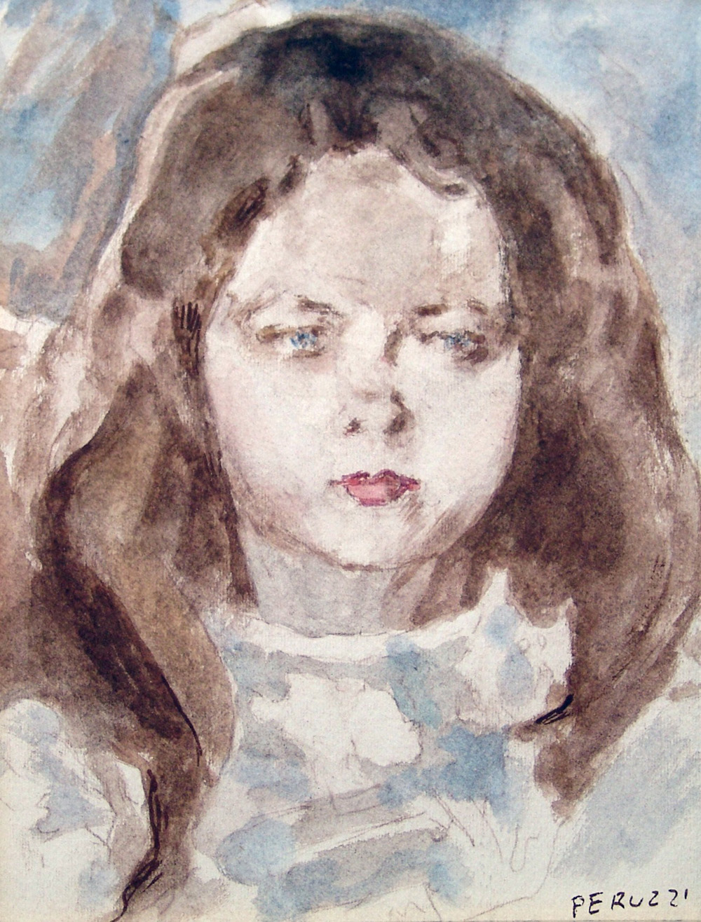 Cesare Peruzzi 1894, Montelupone (Mc) - 1995, Recanati (Mc) - [Italia] Ritratto di bambina acquerello su carta 24x18 cm 1982 firma dell’artista in basso a destra; opera con cornice cartiglio sul retro della Galleria Gioacchini di Ancona