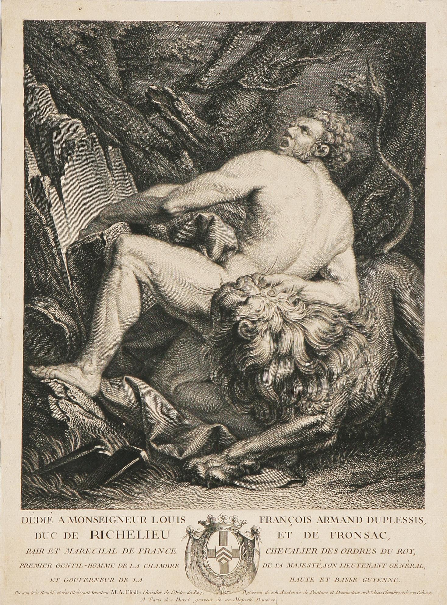 MICHEL JEAN BAPTISTE (1748 - 1804) La morte di Ercole. 1780. Acquaforte. Cm 32x43. Incisione calcografica all’acquaforte tratta da un dipinto di M. A. Challe e stampato a Parigi da Duret - Parigi 1780 ca. - Dim. della stampa rifilata al calco del rame L. 32 x 43 cm. (dim. della sola parte incisa escluse le lettere e lo stemma: L. 28,8 x 34,8 cm.).Bibliogr.: E. BENEZIT, VII, 388 (Ed. del 1976) - LE BLANC, III, 25-26 - BASAN, II, 38 - GORI G., II, 295 - BRYAN’S, II, 65 - HUBER ET ROST, VIII, 298.