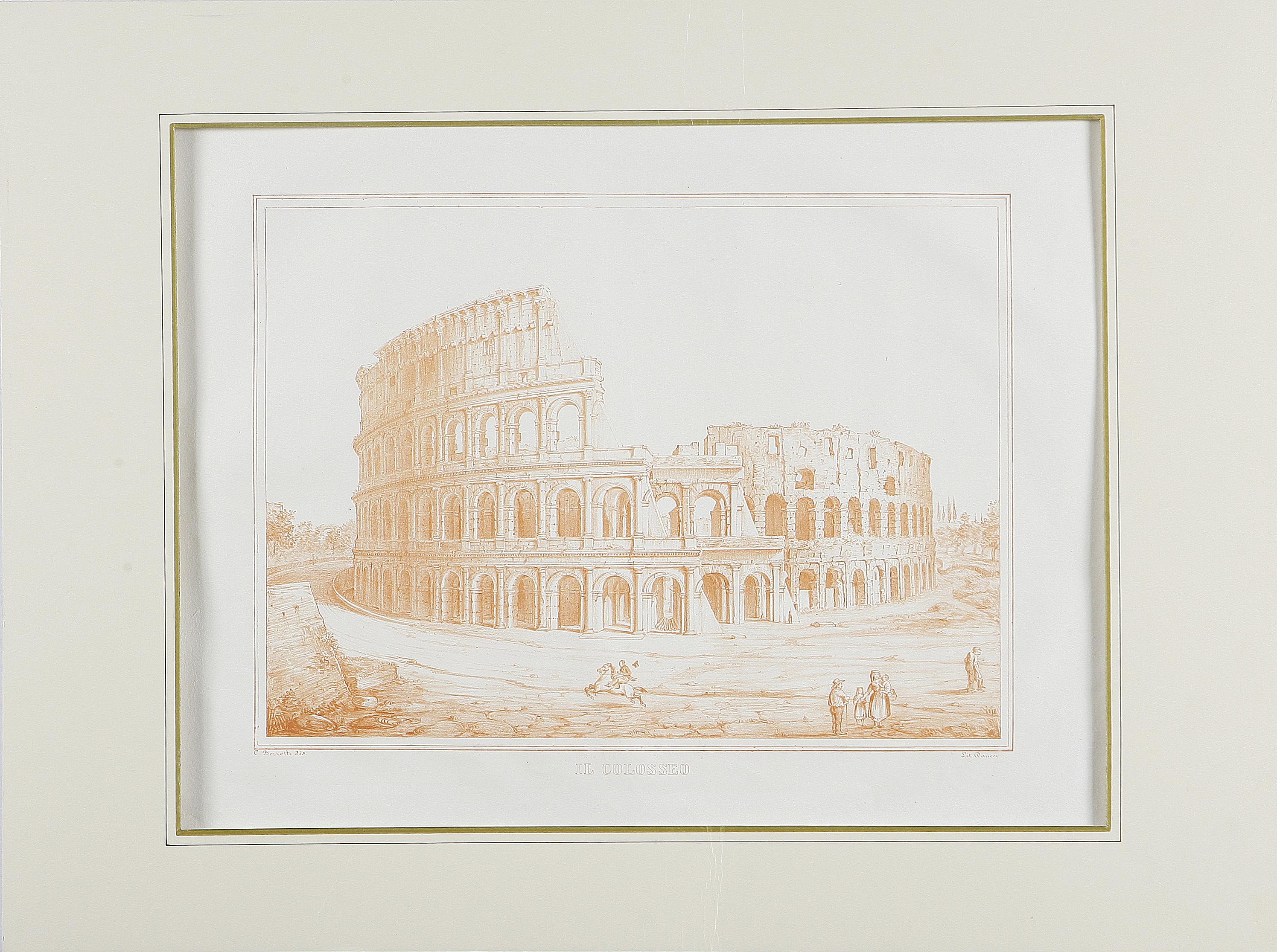 LITOGRAFIA DANESI Il colosseo. Litografia. Cm 61x46,5. Litografia Danesi è attiva a Roma nella metà XIX sec. Incisione litografica col. sanguigna eseguita su disegno di C. Berzotti - Roma metà del XIX° sec. - Dim. dell’intero foglio con ampi margini L. 61 x 46,5 cm. (dim. della sola parte incisa senza le lettere L. 38,7 x 28,6 cm.).