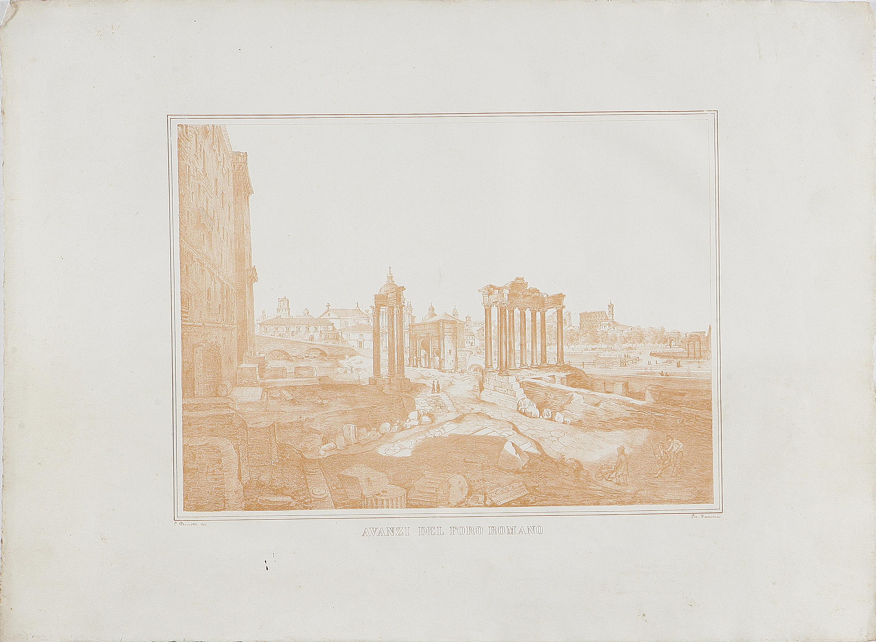 LITOGRAFIA DANESI Avanzi del foro romano. Litografia. Cm 61x46,5. Litografia Danesi è attiva a Roma nella metà del XIX sec. Incisione litografica col. sanguigna eseguita su disegno di C. Berzotti - Roma metà del XIX° sec. - Dim. dell’intero foglio con ampi margini L. 61 x 46,5 cm. (dim. della sola parte incisa senza le lettere L. 38,5 x 28,8 cm.).