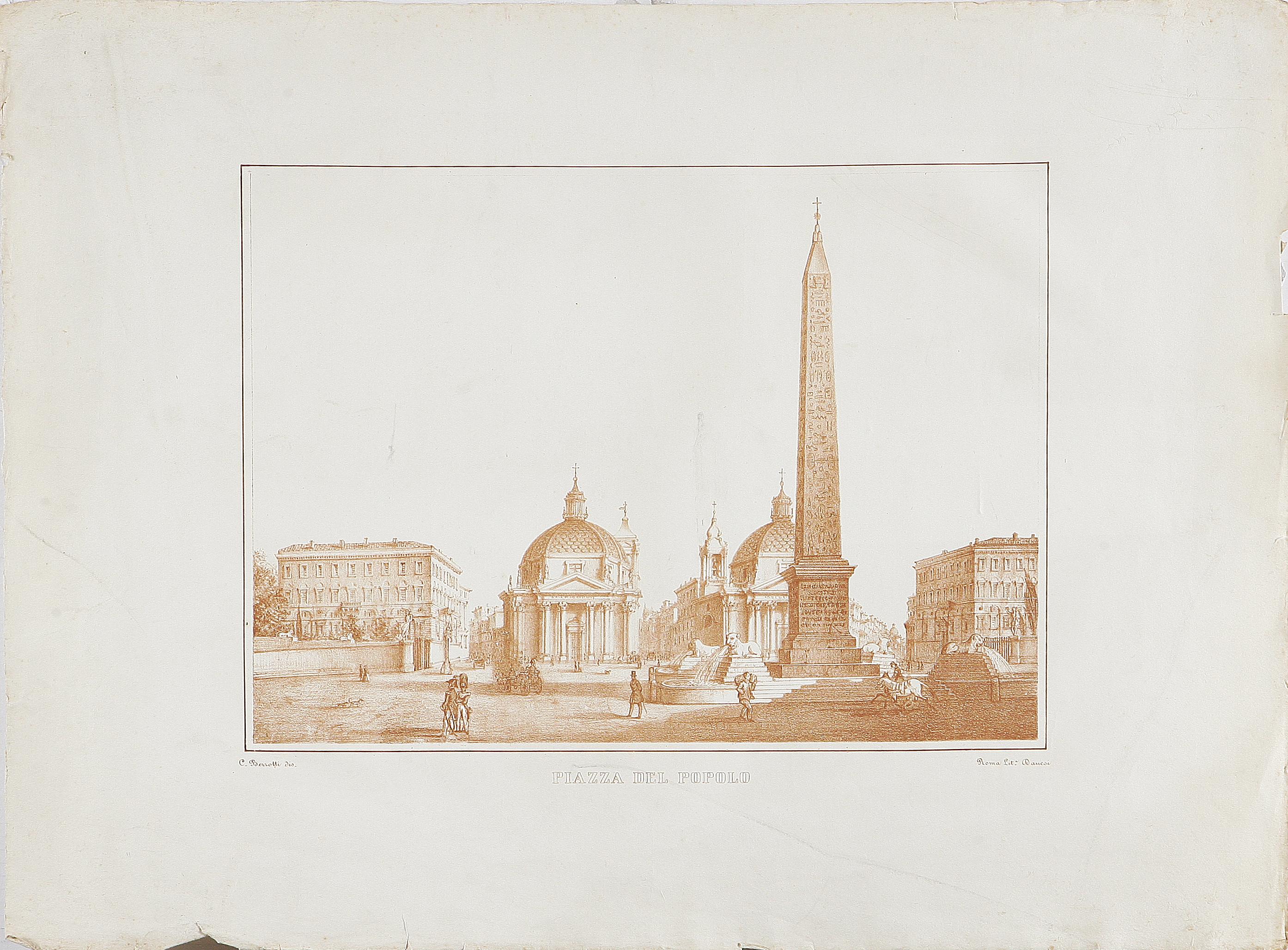 LITOGRAFIA DANESI Piazza del Popolo. Litografia. Cm 61x46,5. Litografia Danesi è attiva a Roma nella metà del XIX sec. Incisione litografica col. sanguigna eseguita su disegno di C. Berzotti - Roma metà del XIX° sec. - Dim. dell’intero foglio con ampi margini L. 61 x 46,5 cm. (dim. della sola parte incisa senza le lettere L. 38 x 28,5 cm.).