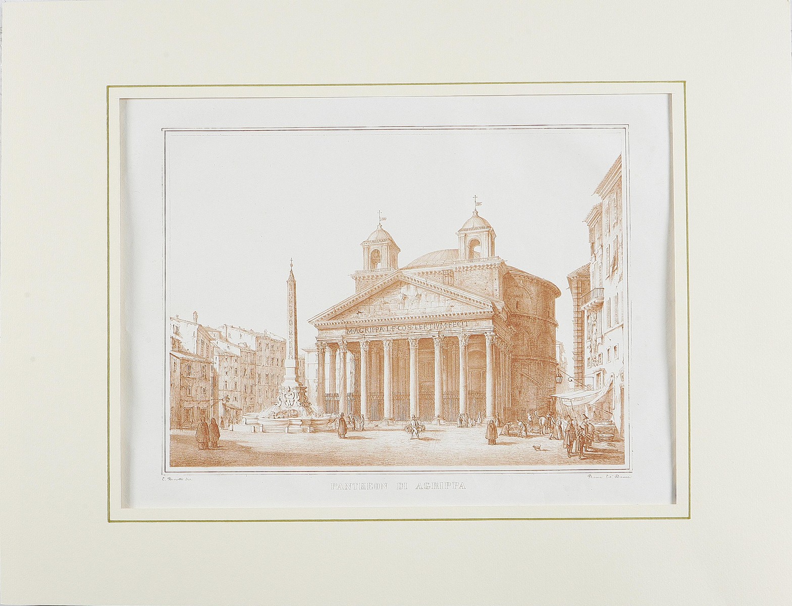 LITOGRAFIA DANESI Pantheon di Agrippa. Litografia. Cm 61x46,5. Litografia Danesi è attiva a Roma nella metà del XIX sec. Incisione litografica col. sanguigna eseguita su disegno di C. Berzotti - Roma metà del XIX° sec. - Dim. dell’intero foglio con ampi margini L. 61 x 46,5 cm. (dim. della sola parte incisa senza le lettere L. 38,5 x 29 cm.).