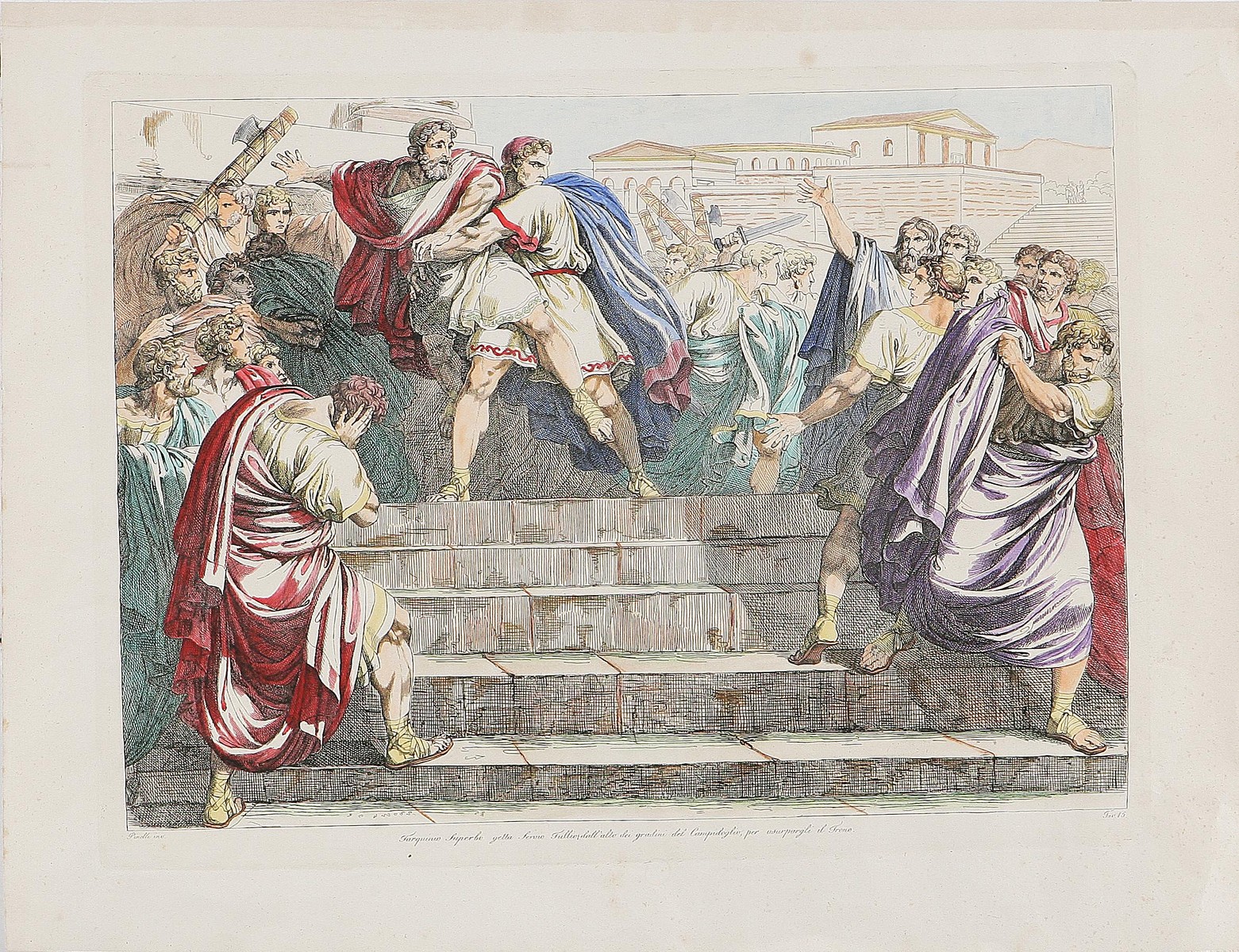 PINELLI BARTOLOMEO (1781 - 1835) Tarquinio il superbo. 1818. Calcografia. Cm 51,7x40,5. Incisione calcografica alla punta con acquerellatura non coeva appartenente alla serie de la Istoria Romana… (tav. 15) - Roma 1818 (ma copia stampata nel 1840 ca.) - Dim. dell’intero foglio con ampi margini L. 51,7 x 40,5 cm. (dim. della sola parte incisa L. 42 x 30,8 cm.).Bibliogr.: FALCONIERI C. - Memoria intorno alla vita ecc. di Bartolomeo Pinelli, 1835 - G. INCISA DELLA ROCCHETTA - Roma 1956 - pp. 206, tav. XLVIII - LE BLANC, II, 206 - BENEZIT, III, 493 (Ed. del 1918) - BRYAN, 1903-05 - THIEME BECKER, Diz 19, 451 (1926).