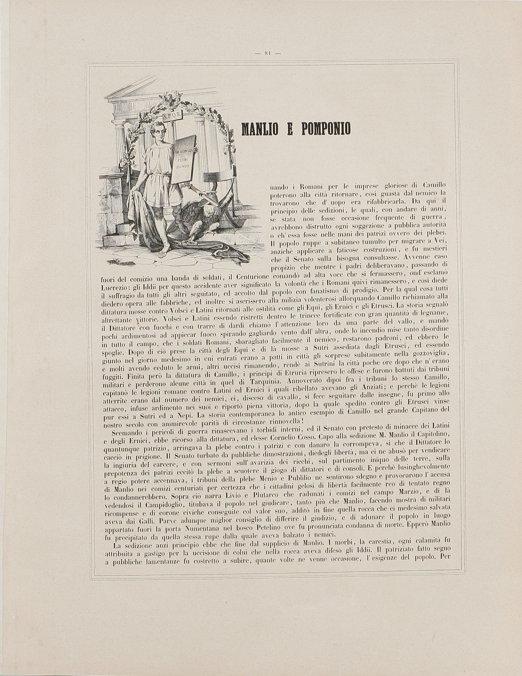 PINELLI BARTOLOMEO (1781 - 1835) Manlio Torquato di fronte a suo padre. 1818. Calcografia. Cm 51,7x40,5. Incisione calcografica alla punta appartenente alla serie de la Istoria Romana… (tav. 40) - Roma 1818 (ma copia stampata nel 1840 ca.) - Dim. dell’intero foglio con ampi margini L. 51,7 x 40,5 cm. (dim. della sola parte incisa L. 42 x 30,4 cm.).Bibliogr.: FALCONIERI C. - Memoria intorno alla vita ecc. di Bartolomeo Pinelli, 1835 - G. INCISA DELLA ROCCHETTA - Roma 1956 - pp. 206, tav. XLVIII - LE BLANC, II, 206 - BENEZIT, III, 493 (Ed. del 1918) - BRYAN, 1903-05 - THIEME BECKER, Diz 19, 451 (1926).