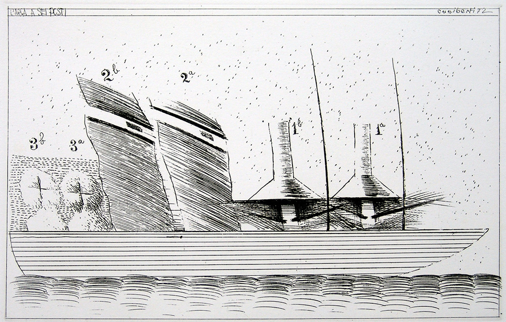 Pier Achille Cuniberti 1923, Sala Bolognese (Bo) - 2016, Bologna (Bo) - [Italia] L'Arca a 6 posti acquaforte 35x50 cm 1972 es. 58/80; firma dell’artista in basso a destra certificato di autenticità Picenum