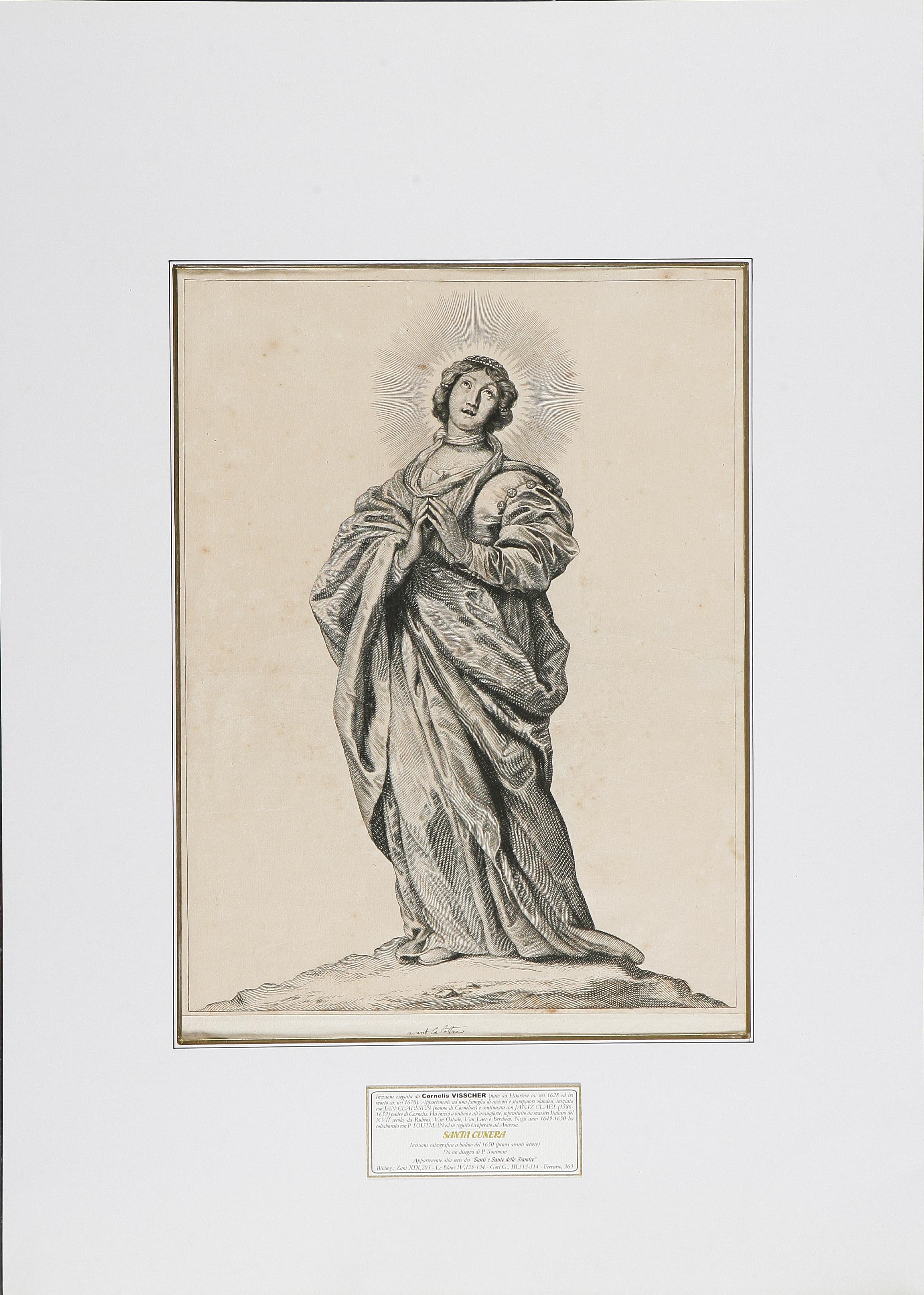 WISSCHER CORNELIS (1628 - 1670) Santa Cunera. 1650. Acquaforte. Cm 32,5x46,5. Incisione all’acquaforte da un disegno di P. Soutman, tratta dalla serie “Santi e Sante delle Fiandre” (1° stato avanti le lettere) - Harlem 1650 - Dim. dell’intero foglio con piccolo margine L. 32,5 x H. 46,5 cm.Bibliogr.; ZANI, xix, 205 - LE BLANC, iv, 129-134 - GORI G., III, 313-314 - FERRARIO, 363 - BRYAN’S, V, 309-310.
