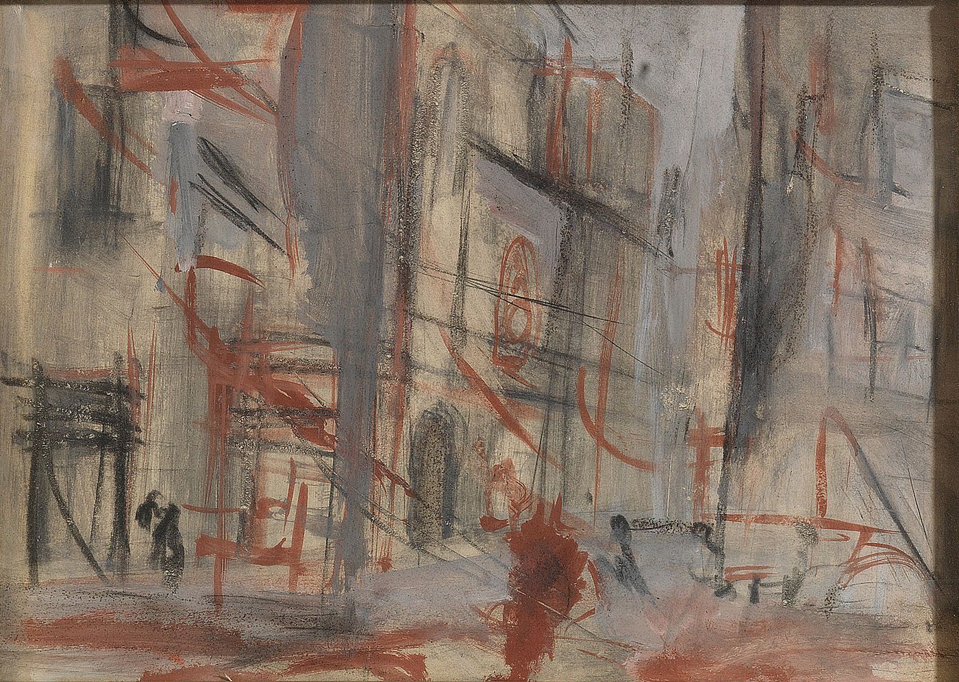 SPAZZAPAN LUIGI Gradisca d'Isonzo (GO) 1889 - 1958 Torino "Bombe su Torino" 26x35,5 tecnica mista su carta rintelata