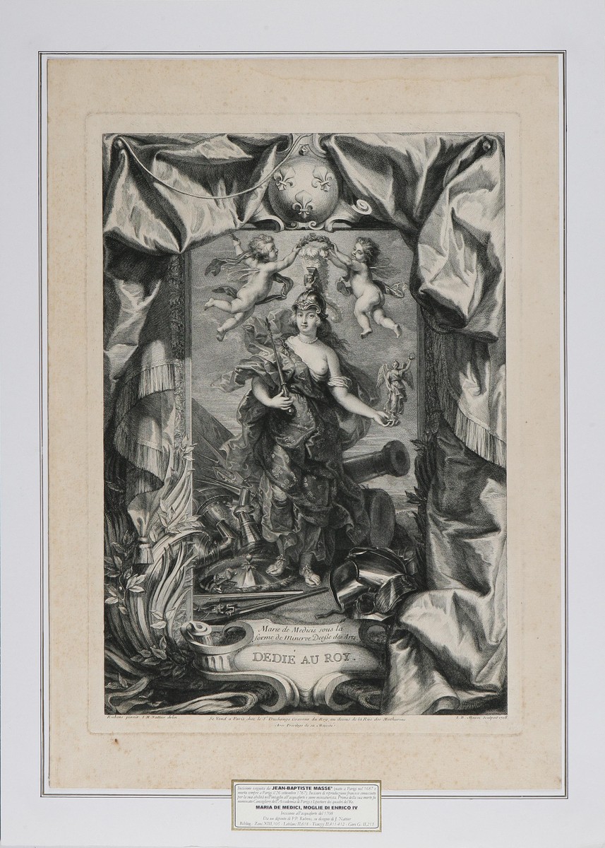 MASSE' JEAN - BAPTISTE (1687 - 1767) Maria Dè Medici, moglie di Enrico IV. 1708. Acquaforte e bulino. Cm 45,8x61. Incisione all’acquaforte e bulino tratta da un dipinto di Rubens su disegno di I.B. Nattier (appartenente alla raccolta dei dipinti di Rubens de “La Galerie du Luxemburg”) - Parigi edizione del 1708 - Dim. della stampa con ampi margini: L. 45,8 x 61 cm. (dim. della sola parte incisa senza le lettere L. 33,3 x 47,8 cm.).Bibliogr.: ZANI, XIII, 105 - LE BLANC, II, 618 - TICOZZI, II, 411-412 - GORI G., II, 313 - MILESI, 221.