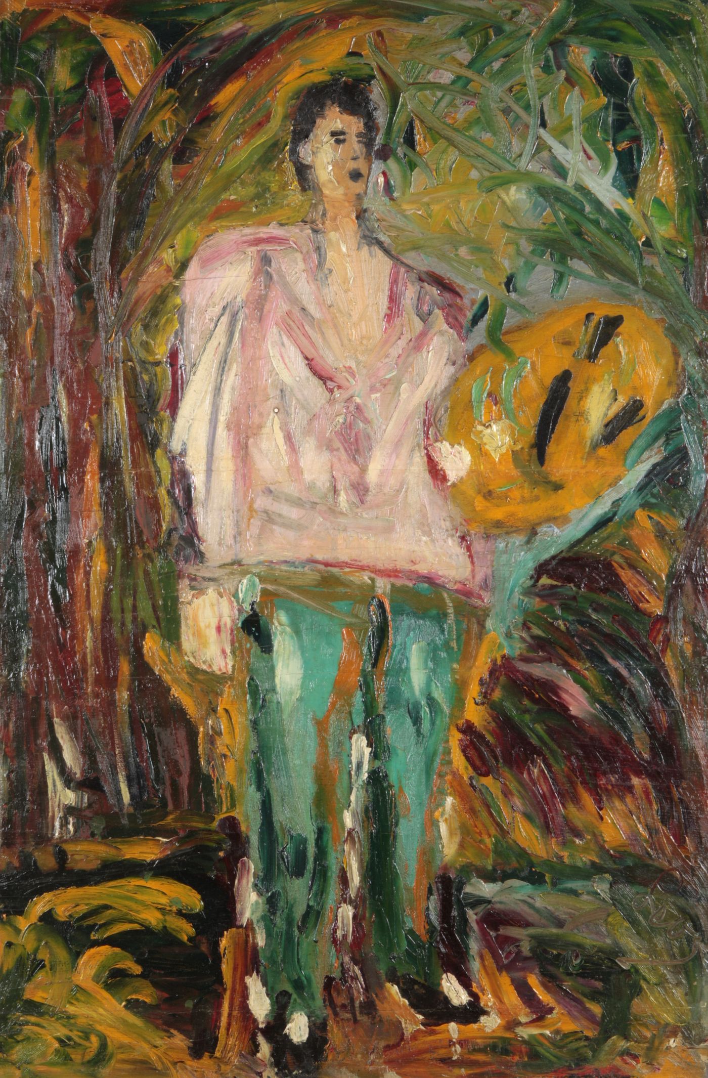 SPAZZAPAN LUIGI Gradisca d'Isonzo (GO) 1889 - 1958 Torino "Il pittore (in piedi con tavolozza)" 1936 circa 78,5x51,5 olio su tavola Esp.: - 1960, Milano, Galleria Re Magi, "Luigi Spazzapan" Bibl.: - Angelo Dragone, "Spazzapan", catalogo generale a cura di Sandro Alberti e Angelo Dragone, Vallecchi 1981, n. 590, pag. 179