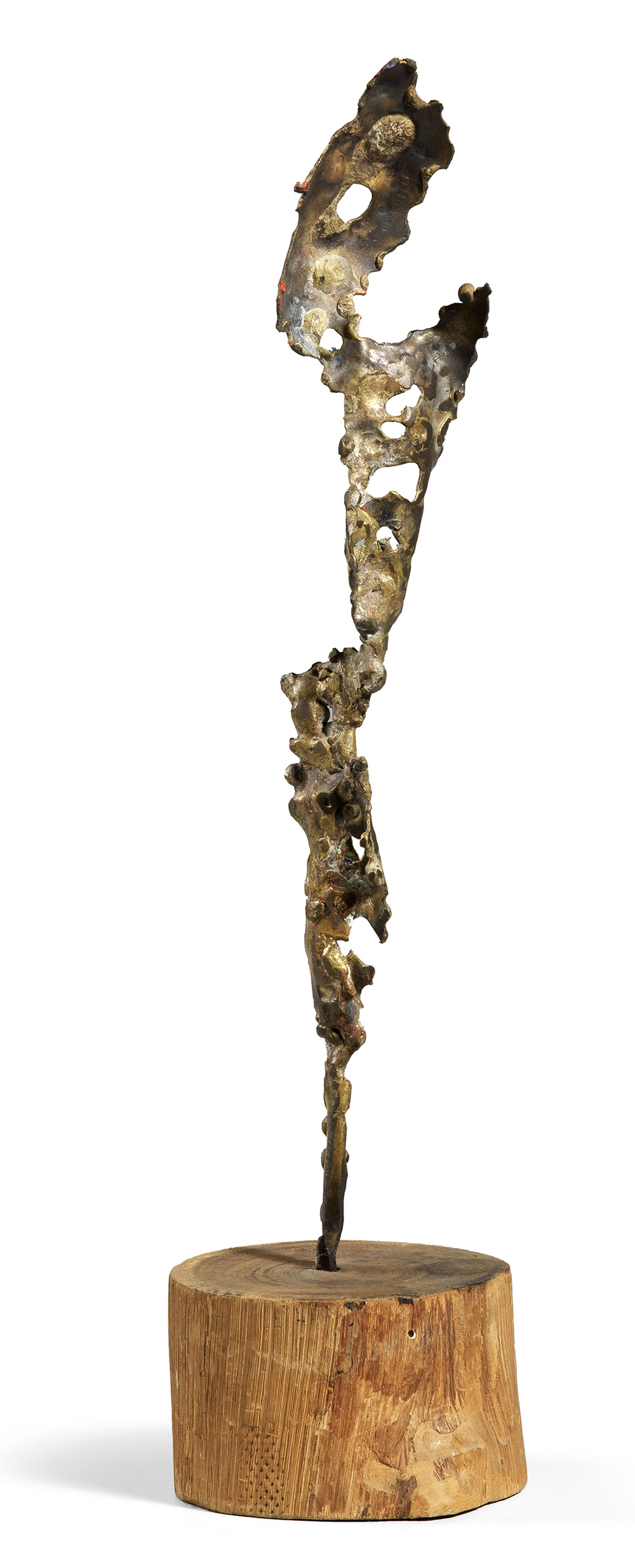 Nino Franchina, Palmanova (Ud) 1912 - Roma 1987, Senza titolo, 1959, Scultura in ottone su base in legno, cm. 35,5 (con base), Firma in alto: Nino / Franchina; scritta sotto la base: Nino / Franchina / "ottone" / 1959.