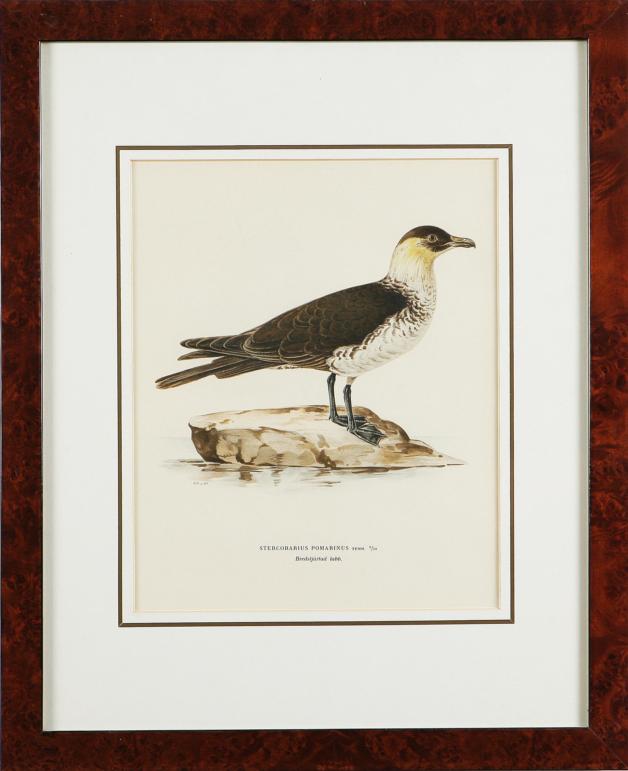 FAGLAR SVENSKA Stercorarius pomarinus. 1927. Litografia a colori. Cm 30x38. Cromolitografia edita in Svezia (Stoccolma ed. 1927) della serie di stampe realizzate dai fratelli naturalisti e disegnatori Wilhem, Ferdinand e Marcus von Wright, con la collaborazione del disegnatore Bror Halberg- Dim. del foglio L. 30 x 38 cm. (dim. della cornice in radica ludida con passpartout col. avorio: L. 45 x H. 55 cm.