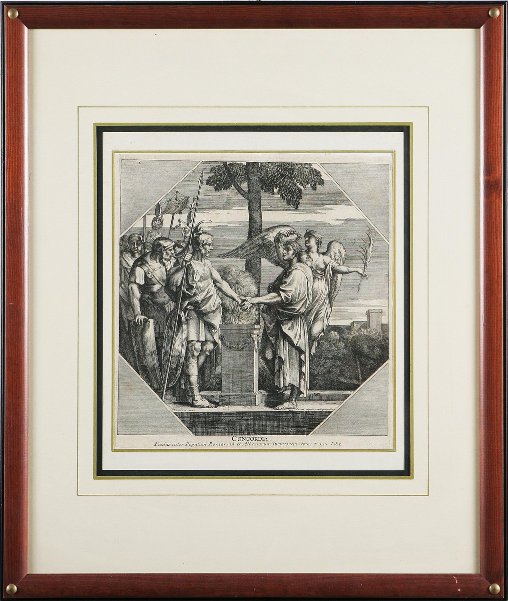 BOURDON SEBASTIEN (1616 - 1671) Concordia. Acquaforte. Cm 31,2x32,6. Incisione calcografica all’acquaforte (tav. 2) appartenente alla serie delle “Virtù Abituali” - Parigi seconda metà del XVII° - Dim. della stampa con piccolo margine L. 31,2 x 32,6 cm. (dim. della sola parte incisa senza le scritte: L. 29,3 x 30 cm.) - Dim. della cornice in legno e con borchie ottone: L. 55 x H. 65 cm.Bibliogr.: LE BLANC, I, 494 - MILESI, 83 - E. BENEZIT, II, 235-236 (Ed. del 1976) - GORI G., I, 136 - BRYAN’S, I, 181-183.