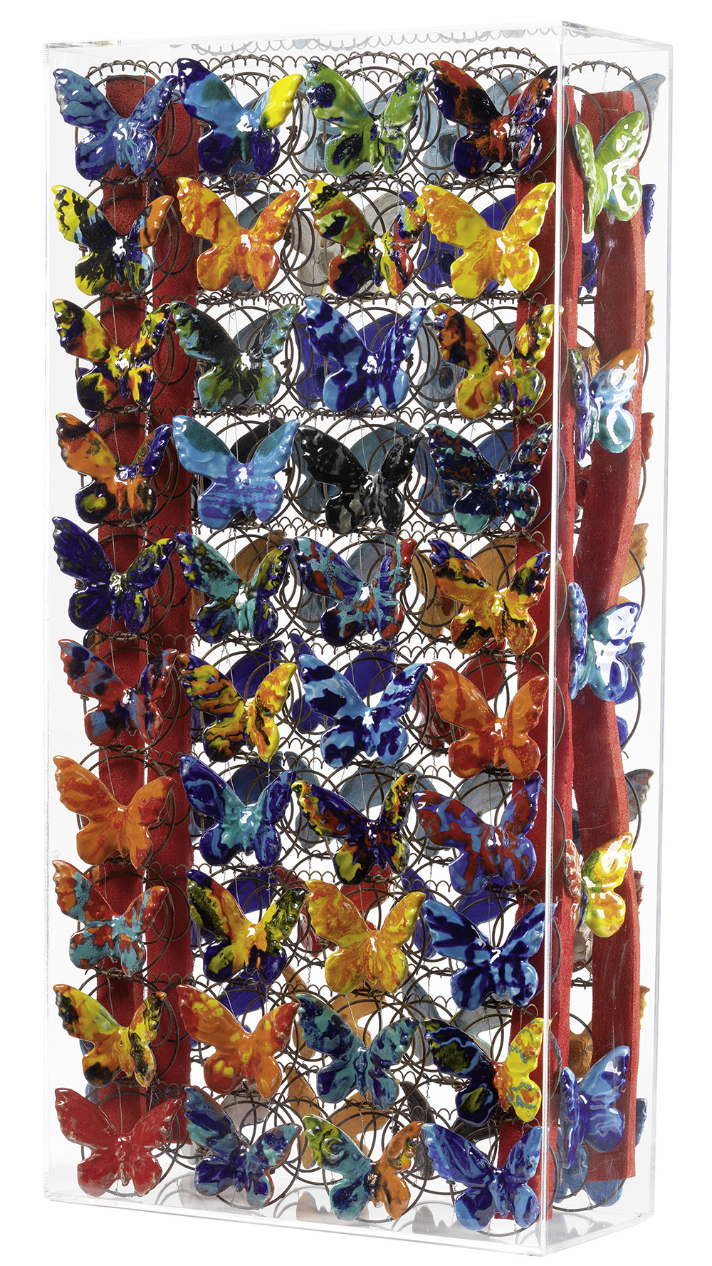 Marcello Lo Giudice, Taormina (Me) 1957, Farfalle, 2011, Farfalle di ceramica in teca di plexiglass, cm. 85x41,5x17,5 (teca), Firma e data sul retro di una farfalla: Lo Giudice / 2011., Foto autenticata dall'artista, Milano, 9-9-2018.