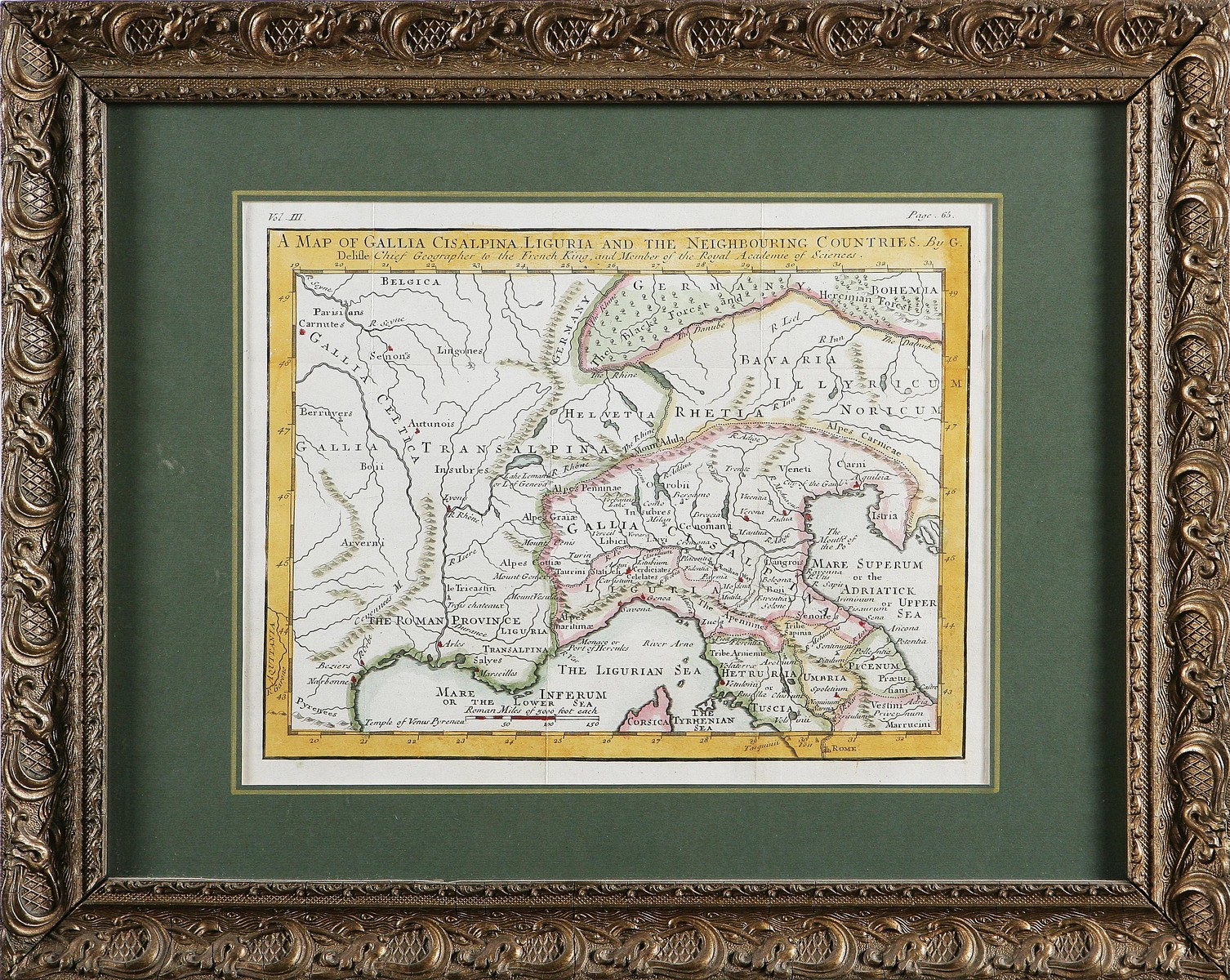 DELISLE GUILLAUME (1675 - 1726) Mappa dell'Italia del nord (Gallia Cisalpina). Incisione. Cm 32x25. Incisione su rame con acquerellatura coeva - Parigi seconda metà del XVIII° sec. - Dim. della stampa con L. 32 x 25 cm. ca (dim. della cornice inizi ‘900: L. 49 x 39,5 cm.).