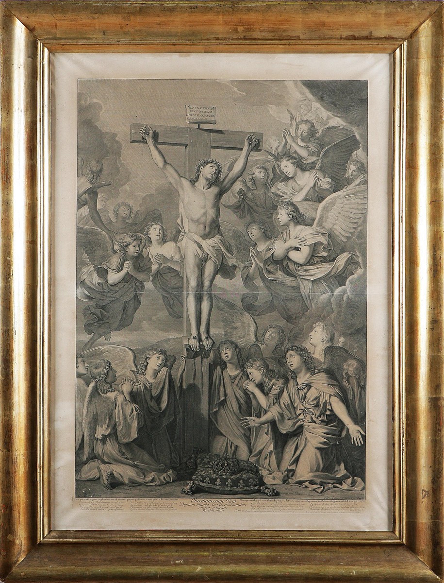 GERARD EDELINCK (1640 - 1707) Il Cristo agli angeli. Bulino. Cm 64,8x95,8. Incisione calcografica a bulino in due fogli tratta da un dipinto di C. Le Brun (3° stato su 3) - Parigi fine ‘600 - primi ‘700 - Dim. della stampa intera L. 64,8 x H. 95,8 di cui circa 32 di margine (Dim. della cornice ‘700 in legno foglia oro: L. 99 x H. 129 cm.).Bibliogr.: E. BENEZIT, II, 202-204 (Ed. del 1918) - LE BLANC, II, 183-191 - MILESI, 138 - R. DUMESNIL & G. DUPLESSIS, VII, 169-336 e XI, 190 - GORI G., I, 307, 310 - H. MIREUR, III, 61-84.