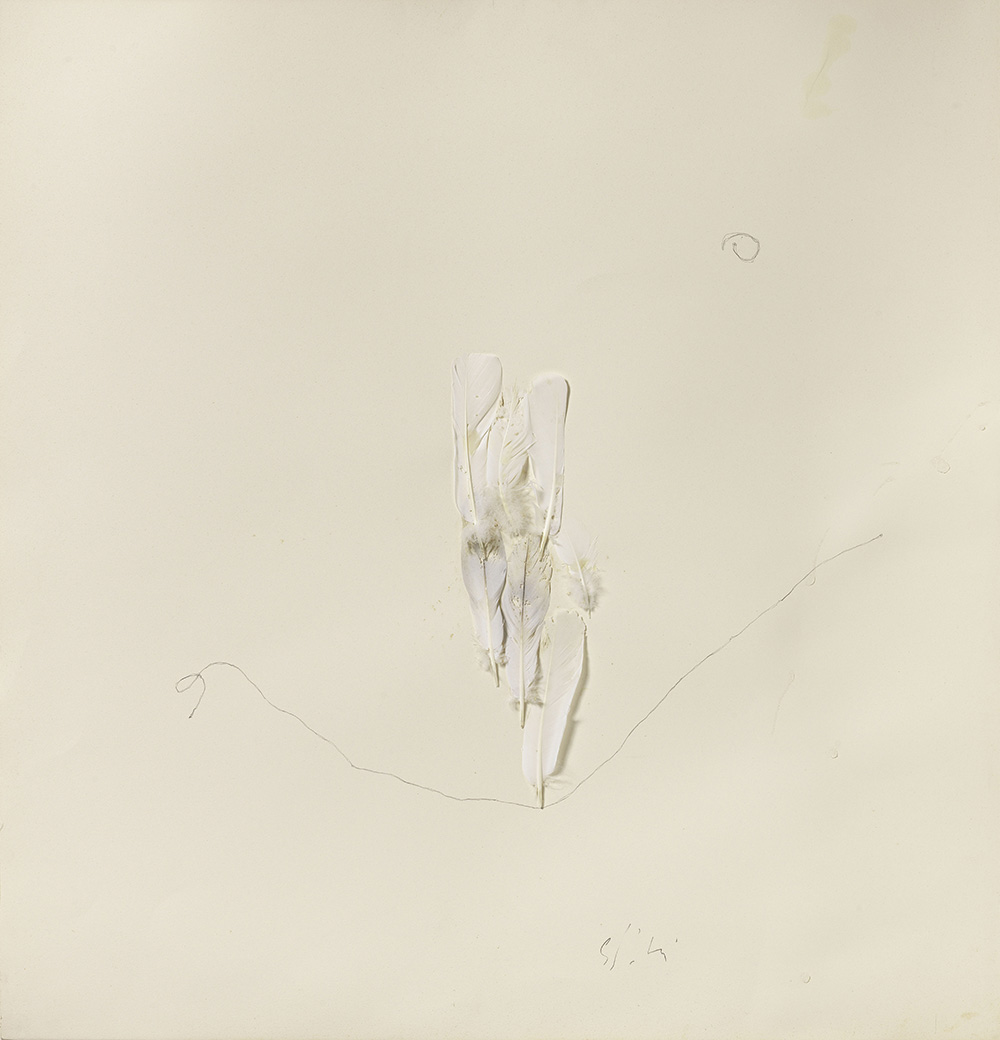 Pier Paolo Calzolari, Bologna 1943, Senza titolo, Matita e piume su carta, cm. 69x67, Firma in basso a destra: Pier Paolo Calzolari.