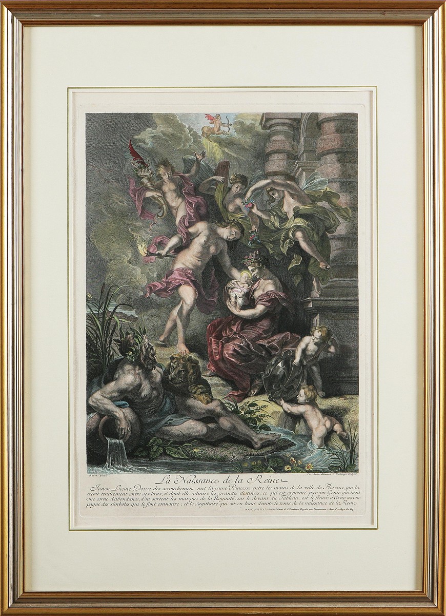 DUCHANGE GASPARD (1666 - 1757) La nascita della regina. 1709. Acquaforte e bulino. Cm 45,8x61. Incisione all’acquaforte e bulino con acquerella tura con coeva, tratta da un dipinto di Rubens su disegno di I.B. Nattier (appartenente alla raccolta dei dipinti di Rubens de “La Galerie du Luxemburg”) - Parigi 1709 - Dim. della stampa con ampi margini: L. 45,8 x 61 cm. (dim. della sola parte incisa senza le lettere L. 33,5 x 44,1 cm.) - Dim. della cornice moderna in legno dorato L. 55 x H. 75 cm.Bibliogr.: ZANI, XV, 15 e varie - LE BLANC II, 148-149 - VALLARDI, 174 - GORI G., I, 296-297 - MILESI, 132.