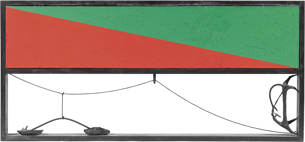 Giuseppe Maraniello, Napoli 1945, 06,21-18,04/18,04-06,22, 1992, Ottone, bronzo, corda e acrilico su tela, cm. 57x124,5x6, Firma, data, titolo e scritta al verso sulla tela: Giuseppe Maraniello / 1992 / "06,21-18,04/18,04-06,22" / Questa tela fa parte di un lavoro più / complesso costituito da un elemento di ottone e bronzo (+ corda) / che la contiene., Foto autenticata dall'artista.