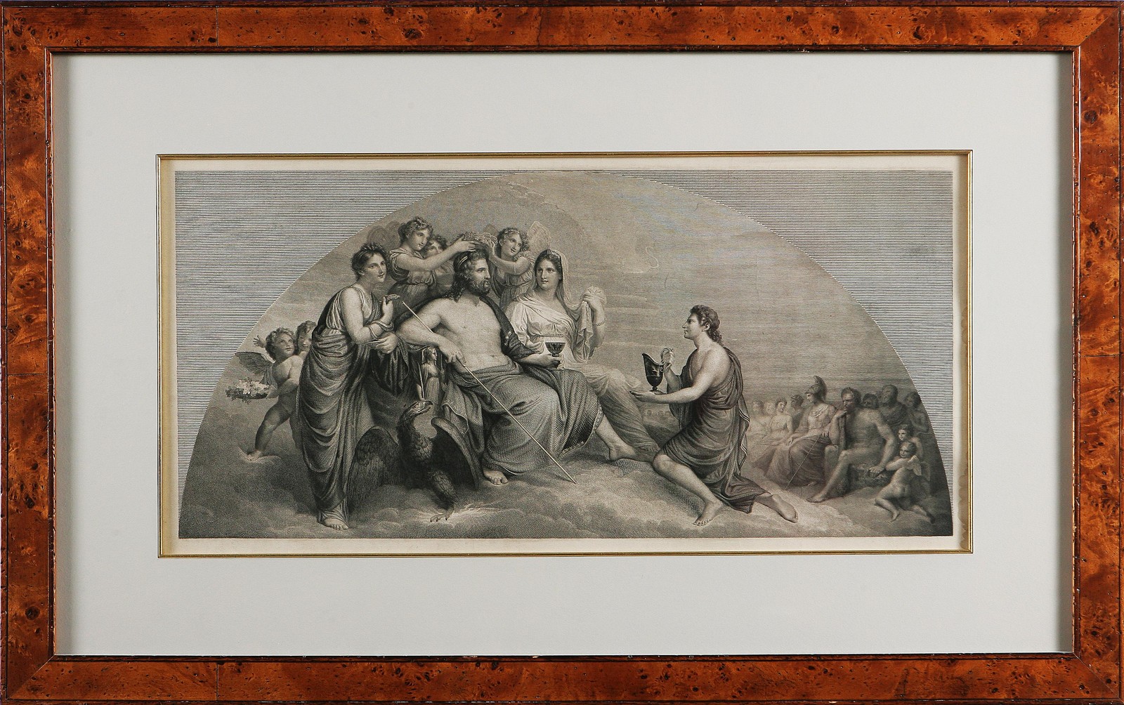 ANONIMO Giove nell'Olimpo degli Dei. Bulino. Cm 67x34. Autore sconosciuto di epoca settecentesca di scuola romana. Incisione calcografica a bulino - Roma metà del XVIII° sec. - Dim. della stampa con piccoli margini L. 67 x H. 34 cm. (dim. della sola parte incisa L. 62,5 x 30 cm.) - Dim. della cornice in legno di radica anticata L. 90,5 x 57,5 cm.)