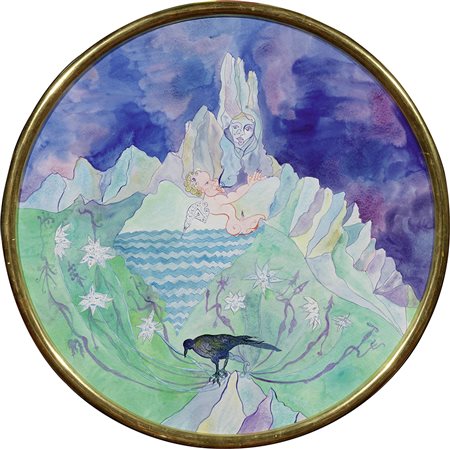 Luigi Ontani, Vergato (Bo) 1943, La Diana di Val "Floriana", 2000, Acquerello su carta, cm. 77 ø (con cornice), Titolo, firma e data al verso: «La Diana di Val Floriana» / Ontani / 2000., Foto autenticata dall'artista.