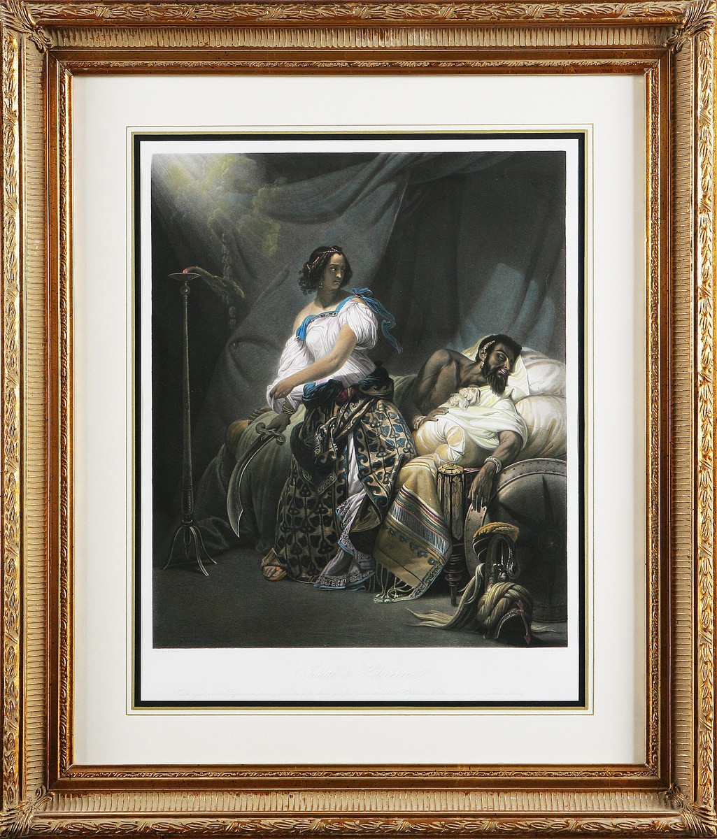 JAZET JEAN PIERRE MARIE (1788 - 1871) Giuditta e Oloferne. Calcografia. Cm 47x58. Incisione calcografica alla maniera nera con coloritura non coeva, tratta da un dipinto di H. Vernet - Parini prima metà del XIX° sec. - Dim. dell’intero foglio con buoni margini L. 47 x H. 58 cm. (dim. della sola parte incisa senza le lettere L. 35,8 x 42,5 cm.) - Dim. della cornice moderna in legno dorato L. 62 x H. 72 cm.Bibliogr.: E. BENEZIT, VI, 48 (Ed. del 1976) - LE BLANC, II, 422-425 - H. BERALDI, VIII, 223-234 - VALLARDI, 286.