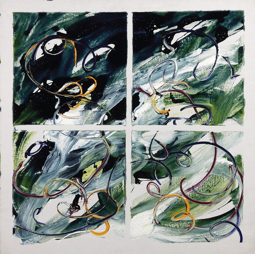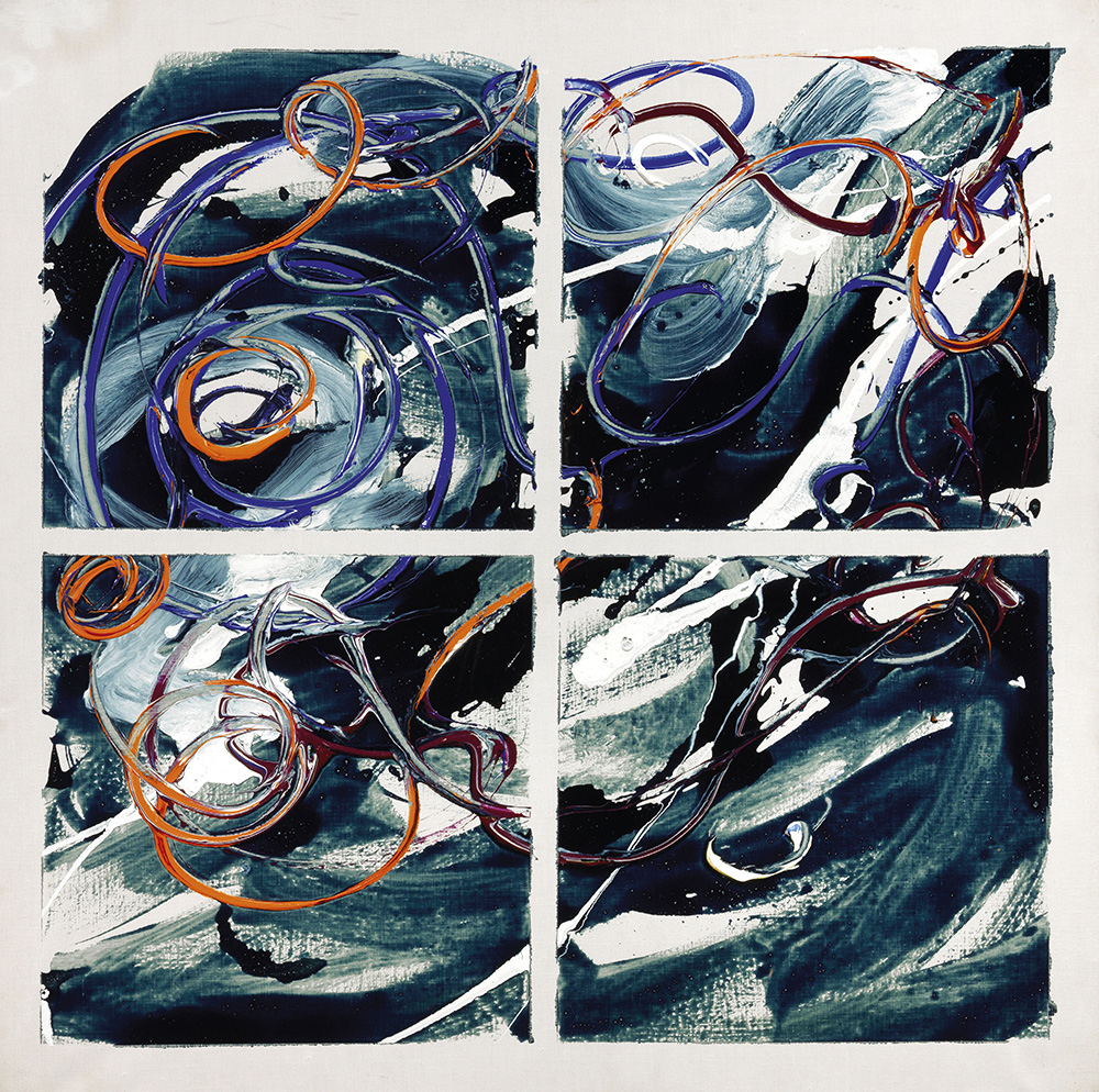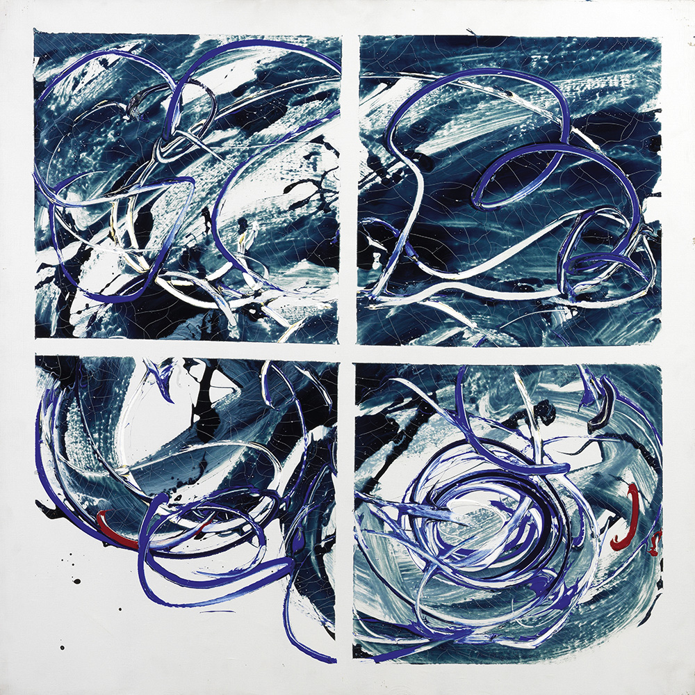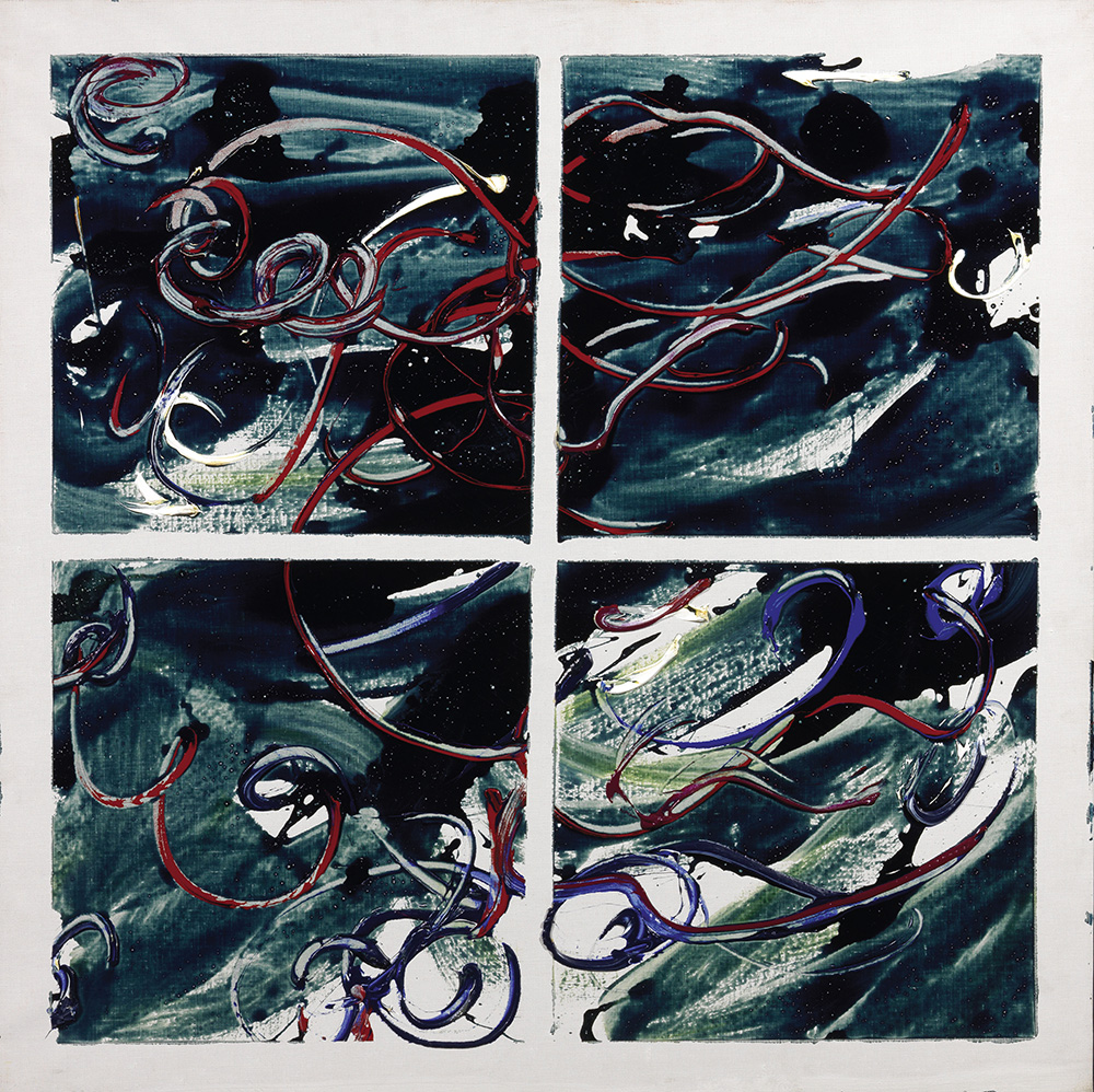 Mario Schifano, Homs 1934 - Roma 1998, Cielo Energia, 1983, Smalto e acrilico su tela, quattro elementi, cm. 100x100 ognuno, Firma e titolo al verso sulla tela di ogni elemento: Schifano / Cielo / Energia., Opera registrata presso l'Archivio Generale dell'Opera di Mario Schifano, Roma, al n. 04026190413., Si tratta di una delle quattro serie dedicate da Mario Schifano al tema dell'energia (Cielo, Sole, Terra e Mare)., Bibliografia di riferimento:, Pittori in Italia nella civiltà dell'energia e dell'elettrotecnica, Milano, Fabbri, 1986, pp. 32, 33 (illustrata la serie Sole Energia).