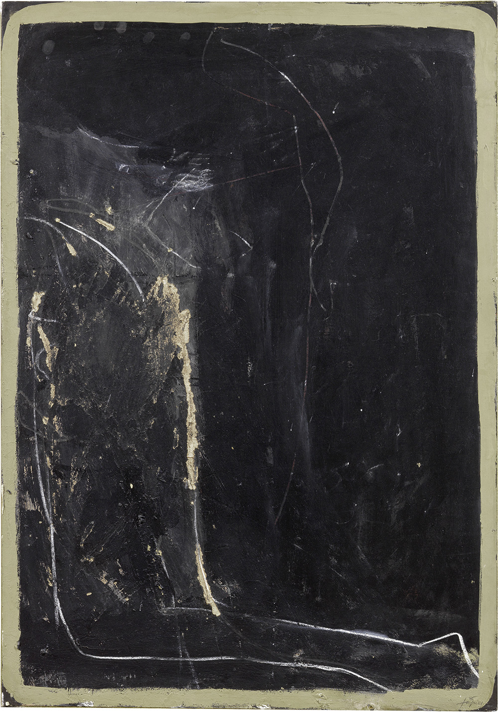 Antoni Tàpies, Barcellona 1923 - 2012, Negro lacerado con el borde ocre, 1965, Tecnica mista su carta applicata su tela, cm. 101x71, Firma in basso a destra: Tàpies. Al verso sulla tela: timbro Il Collezionista d'Arte Contemporanea, Roma, con n. 0633; sul telaio: etichetta Il Collezionista d'Arte Contemporanea, Roma, con n. 0633., Foto autenticata dall'artista, Parigi, 31 maggio 1972., Esposizioni: Antoni Tàpies. Gouachen, Zeichnungen und Collagen aus den Jahren 1963-1965, Monaco, Galerie van de Loo, aprile 1965, cat. p. n.n., illustrata., Bibliografia: Anna Agustí, Tàpies. Obra Completa vol. 2. 1961-1968, Poligrafa S.A., Barcellona, 1990, p. 242, n. 1366.