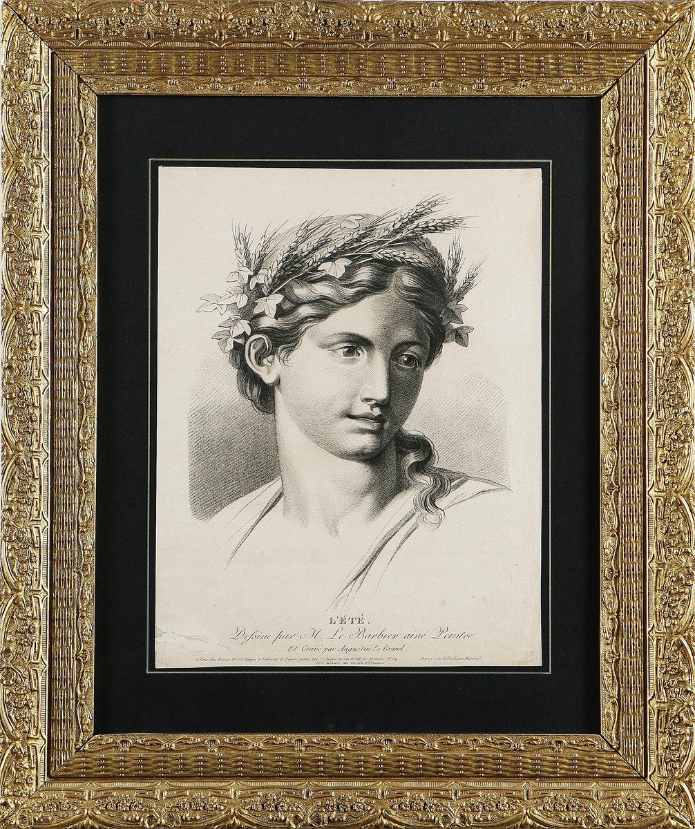 LE GRAND AUGUSTE CLAUDE SIMON (1765 - 1815) L'estate. Calcografia. Cm 29,5x38,5. Incisione calcografica alla maniera del lapis tratta da un disegno di M. Le Barbier ainé - Parigi fine XVIII° sec. - Din. del foglio rifilato al calco del rame L. 29,5 x 38,5 cm. (dim. della cornice a stucco dorata di fine ‘800: L. 53 x H. 63 cm.Bibliogr.: E. BENEZIT, VI, 544 (Ed. del 1976) - MILESI - BRYAN’S, III, 199.