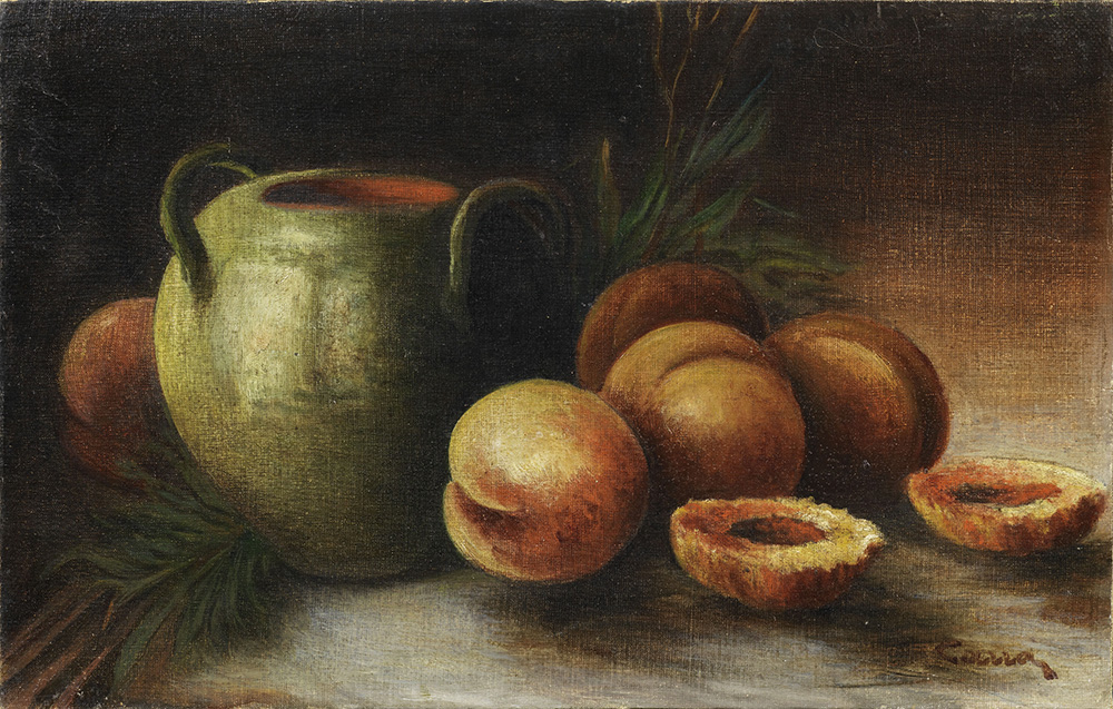 Carlo Carrà, Quargnento (Al) 1881 - Milano 1966, Natura morta, 1906, Olio su tela, cm. 27,5x42,5; Firma in basso a destra: Carrà. Al verso sul telaio: etichetta 100 opere / di Carlo Carrà / Prato - 15 maggio - 18 giugno 1971, con  n. IV: due timbri Galleria Arte Edmondo Sacerdoti, Milano.; Storia, Collezione N. di Palo, Milano;, Collezione E. Sacerdoti, Milano;, Collezione privata; Esposizioni, 100 opere di Carlo Carrà, Prato, Galleria Farsetti, 15 maggio - 18 giugno 1971, cat. tav. IV, illustrato a colori (con titolo Frutti).; Bibliografia, Massimo Carrà, Carrà, tutta l'opera pittorica volume III, 1951-1966, L'Annunciata / La Conchiglia, Milano, 1968, pp. 567, 589, n. 4/06.
