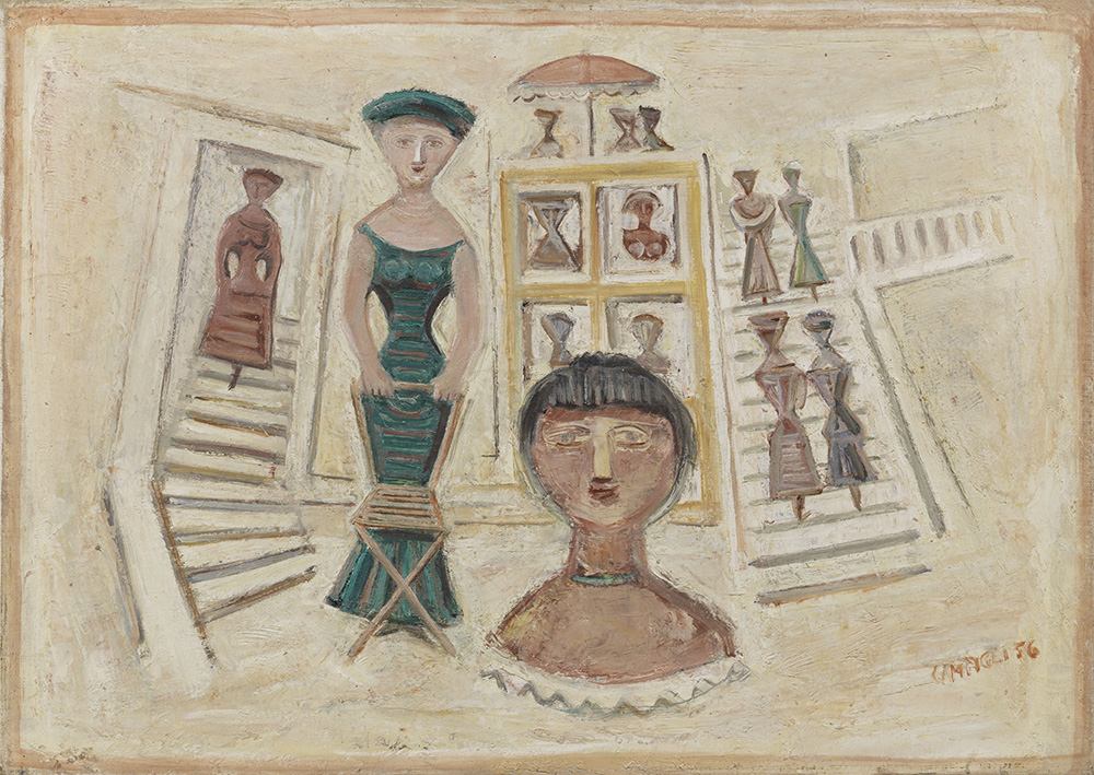 Massimo Campigli, Berlino 1895 - St.Tropez 1971, Figure - Due scalinate, 1956, Olio su tela, cm. 66x92; Firma e data in basso a destra: Campigli 56. Al verso sul telaio: etichetta La Casa dell'Arte, Sasso Marconi, con n. 7396.; Storia, Galleria del Milione, Milano;, Galleria Medea, Milano;, La Casa dell'Arte, Sasso Marconi;, Collezione privata, Moncalieri;, Collezione privata; Certificato su foto di Nicola Campigli, Saint Tropez, 24/4/1984, con n. 84424221.; Esposizioni, Maestri del '900, Pisa, Saletta Viviani, maggio 1992, cat. p. 17, illustrato a colori;, Campigli. Prigioniero di vite trascorse, Bologna, Galleria Marescalchi, 10 ottobre - 15 dicembre 1992, cat. pp. 102, 103, illustrato;, Arte nei secoli, Toscana fra antico e moderno, Farsettiarte, Cortina d'Ampezzo, 8 - 29 agosto, poi Prato, 15 - 30 settembre, poi Milano, 7 - 30 ottobre 1993, cat. n. 39, illustrato a colori.; Bibliografia, Nicola Campigli, Eva Weiss, Marcus Weiss, Campigli, catalogue raisonné, vol. II, Silvana Editoriale, Milano, 2013, p. 696, n. 56-060.
