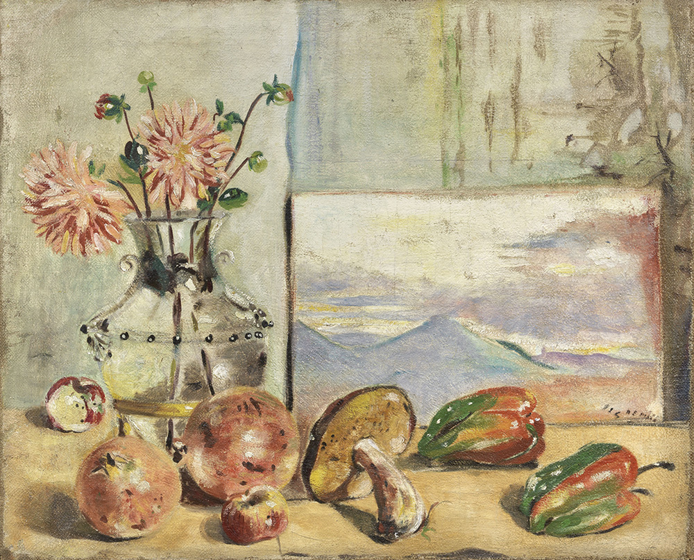 Filippo de Pisis, Ferrara 1896 - Milano 1956, Natura morta con paesaggio, 1924, Olio su tela, cm. 55x67; Firma e data in basso a destra: 924 De Pisis. Al verso sulla tela: etichetta Galleria Annunciata, Milano; sul telaio: etichetta Mostra della Natura Morta Italiana / Napoli - Zurigo - Rotterdam / settembre 1964 - marzo 1965: timbro Galleria Annunciata, Milano, con n. 01393: due etichette Galleria Milano, Milano, una con n. 1560 e data 1-7-931, l'altra con n. 1352 e data febbraio 1932:  etichetta proprietà [Gussoni]: etichetta Mostra della Natura Morta / Italiana a Napoli: timbro Collezione Walter Fontana.; Storia, Galleria Milano, Milano;, Collezione Gussoni, Milano;, Collezione Mazzotta, Milano;, Galleria Annunciata, Milano;, Galleria Farsetti, Prato;, Collezione Walter Fontana, Monza; Certificato su foto Associazione per il Patrocinio dell'Opera di Filippo de Pisis, Milano, 12 novembre 2010, con n. 03696.; Esposizioni, La natura morta italiana, Napoli, Palazzo Reale, ottobre - novembre 1964, poi Zurigo, Kunsthaus Zürich e Rotterdam, Museum Boijmans van Beuningen, ottobre 1964 - marzo 1965, cat. n. 355;, 100 Opere di Filippo De Pisis, Prato, Galleria Farsetti, 19 maggio - 19 giugno 1973, cat. tav. CXVII, illustrato;, De Pisis e Montale: le occasioni tra poesia e pittura, Mendrisio, Museo d'Arte, 29 aprile - 26 agosto 2012, cat. p. 66, n. 3;, Mediterraneo. Luoghi e miti. Capolavori del Mart, Messina, Museo Interdisciplinare Regionale, 9 dicembre 2016 - 5 marzo 2017, cat. p. 130.; Bibliografia, Guido Ballo, Filippo De Pisis, Edizioni La Simonetta, 1956, tav. 4;, Guido Ballo, De Pisis, Edizioni Ilte, Torino, 1968, n. 132;, Elvio Natali, Vita di De Pisis, in Filippo De Pisis, venti opere venti anni dopo, Galleria Farsetti, Focette, 1976, p. 12, cit.;, Giuliano Briganti, De Pisis. Catalogo generale, tomo primo, opere 1908-1938, con la collaborazione di D. De Angelis, Electa, Milano, 1991, p. 55, n. 1924 26.