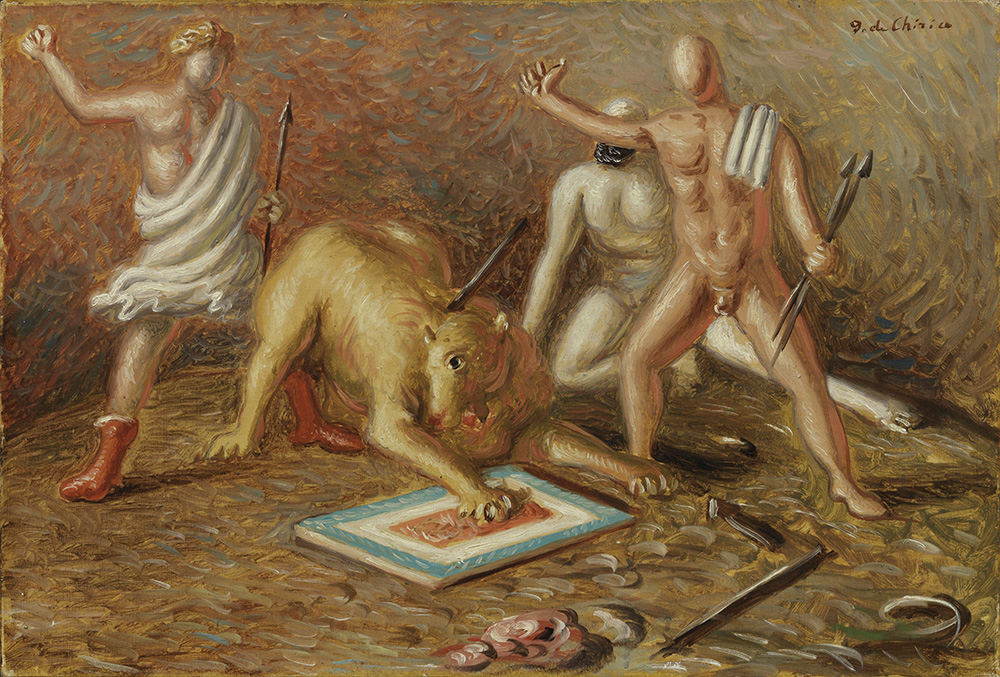 Giorgio de Chirico, Volos 1888 - Roma 1978, Combattimento di gladiatori con la belva, 1929-30, Olio su tela, cm. 38,2x55,2; Firma in alto a destra: G. de Chirico. Al verso sul telaio: etichetta e timbro Galleria Gian Ferrari / Milano, con n. 3102: etichetta De Chirico / Gli anni Venti / Mostra Celebrativa col Patrocinio / della Regione Veneto e / della Fondazione Giorgio e Isa De Chirico / Galleria Civica d'Arte Moderna / e Contemporanea Palazzo Forti / Galleria dello Scudo / Verona / 14 dicembre 1986 - 16 febbraio 1987: etichetta De Chirico / Gli anni Venti / Mostra celebrativa / col Patrocinio della Fondazione / Giorgio e Isa De Chirico / Comune di Milano / Settore Cultura e Spettacolo / Palazzo Reale / 6 marzo - 26 aprile 1987: etichetta parzialmente strappata Kunsthaus Zuri[ch]: etichetta Galerie Beyeler, Basel, con n. 10134: etichetta Galleria dello Scudo / Verona.; Storia, Collezione privata, Milano;, Collezione J. Spillmann, Zurigo;, Galerie Beyeler, Basilea;, Collezione privata; Certificato su foto di Claudia Gian Ferrari, studio di consulenza per il '900 italiano, Milano, 13 gennaio 2001, con n. 3102.; Esposizioni, De Chirico gli anni Venti, Verona, Galleria d'Arte Moderna e Contemporanea Palazzo Forti e Galleria dello Scudo, 14 dicembre - 31 gennaio 1987, poi Milano, Palazzo Reale, 7 marzo - 18 aprile 1987, cat. pp. 166, 167, illustrato a colori;, Giorgio de Chirico. Dalla partenza degli Argonauti alla vita silente, Lerici, Castello Monumentale, 10 luglio - 2 ottobre 1988, poi Saragozza, Sala del Museo Pablo Gargallo, ottobre - dicembre 1988, cat. pp. 60, 61, illustrato a colori;, Giorgio de Chirico 1920-1950, New York, 26 East 80th Street, 29 novembre 1990 - 15 gennaio 1991, cat. pp. 98, 99, illustrato a colori;, Giorgio de Chirico. Gladiatori 1927-1929, Varese, Villa Panza, 4 ottobre - 14 dicembre 2003, cat. pp. 102, 103, 130, illustrato a colori e in bianco e nero.; Bibliografia, Claudio Bruni Sakraischik, Catalogo Generale Giorgio de Chirico, volume ottavo, opere dal 1908 al 1930, Electa Editrice, Milano, 1987, p. n.n., tav. 521 (con titolo I gladiatori).