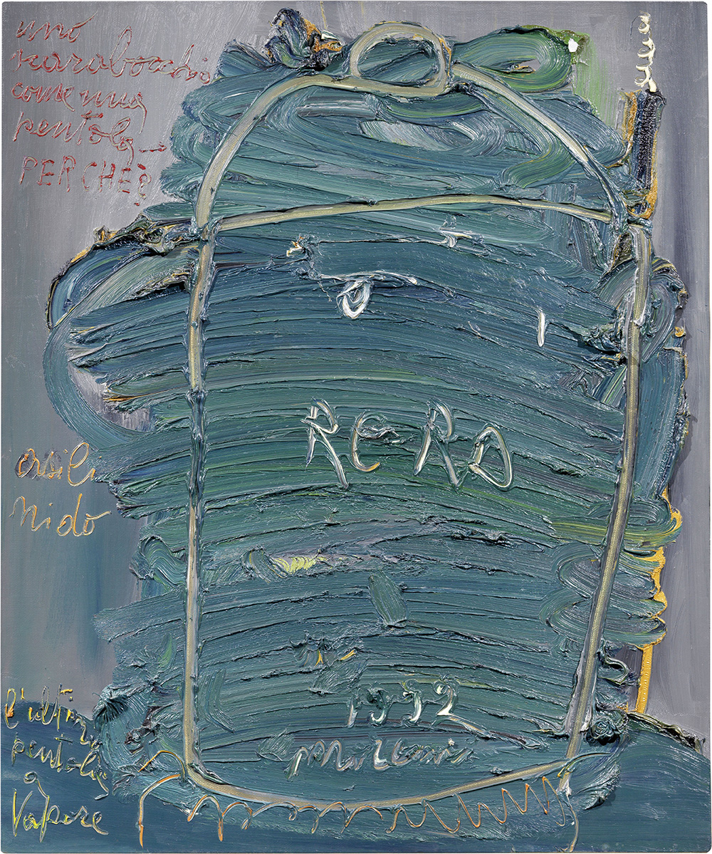 Mattia Moreni, Pavia 1920 - Ravenna 1999, L'ultima pentola a vapore, 1992, Olio su tela, cm. 120,5x100; Data e firma in basso al centro: 1992 / Moreni; firma, data e scritta al verso sulla tela: Moreni / 1992 / Uno scarabocchio / come una pentola artificato.; Esposizioni, La forza della pittura. Carmassi, Fabbri, Milani, Moreni, Aricò, Madella, Raciti, Vago. Confronto di generazioni, Milano, Galleria Morone, 8 febbraio - 20 marzo 2007, cat. p. 30, illustrato a colori;, Oltre l'oggetto. Morandi e la natura morta oggi in Italia, a cura di Marilena Pasquali, Francavilla al Mare, Museo Michetti, 29 giugno - 30 settembre 2007, cat. p. 92, illustrato a colori;, L'alibi dell'oggetto. Morandi e gli sviluppi della natura morta in Italia, a cura di Marilena Pasquali, Lucca, Fondazione Ragghianti, 16 novembre 2007 - 20 gennaio 2008, cat. p. 104, illustrato a colori.; Bibliografia, Enrico Crispolti, Mattia Moreni. Catalogo ragionato delle opere. Dipinti 1934-1999, Silvana Editoriale, Cinisello Balsamo, 2016, p. 589, n. 6/1992/8.