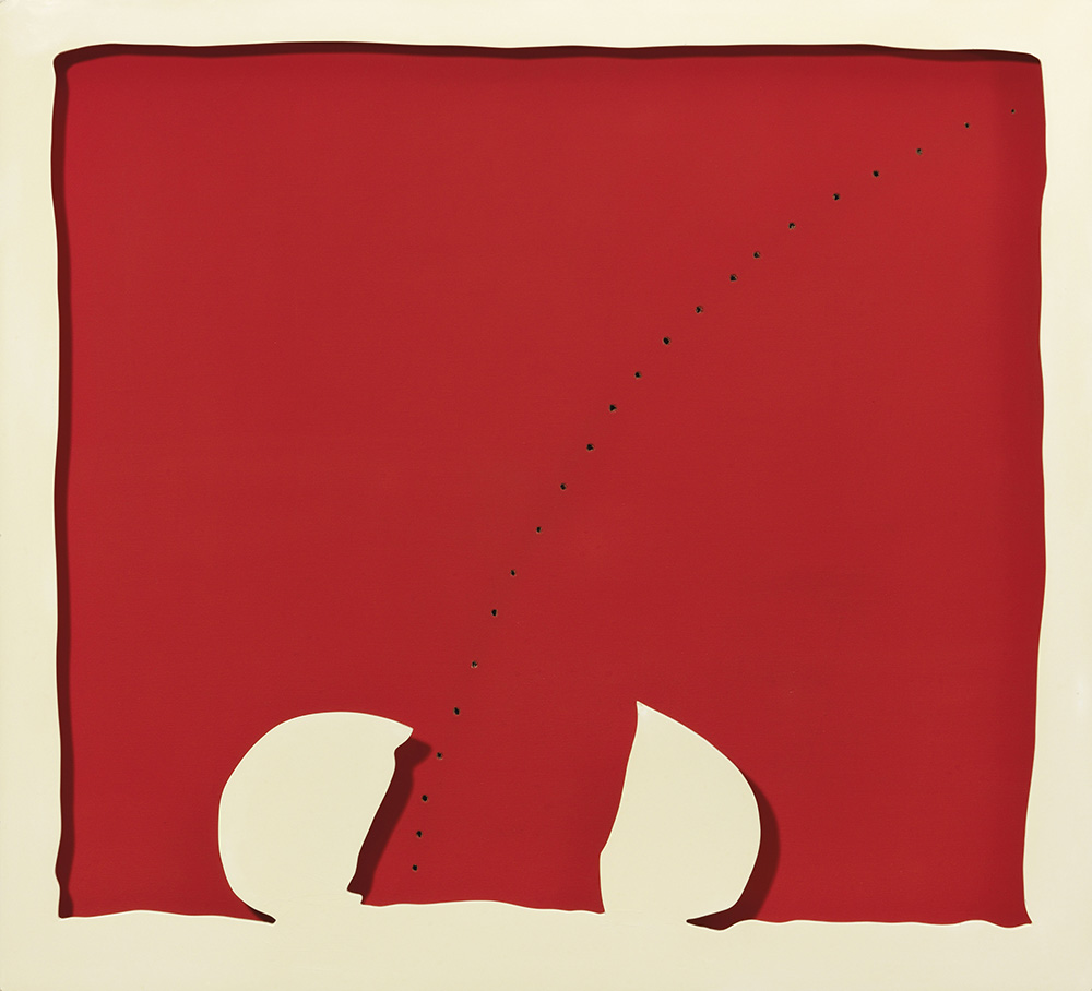 Lucio Fontana, Rosario Santa Fè 1899 - Varese 1968, Concetto spaziale (Teatrino), 1965, Idropittura su tela, rosso, e legno laccato, bianco, cm. 100x110; Firma e titolo al verso sulla tela: L. Fontana / "Concetto Spaziale"; sul telaio: etichetta Galerie Bonnier, Genève, con n. 73019.; Storia, Galerie Pierre, Stoccolma (Archivio Fontana n. 1138/26);, Galleria Medea, Milano (Archivio Fontana n. 1023/20);, Collezione Giuseppe Colavito, Milano (Archivio Fontana n. 1237/12);, Collezione privata, Lonate Pozzolo;, Collezione privata; Bibliografia, Enrico Crispolti, Lucio Fontana. Catalogue raisonné des peintures, sculptures et environnements spatiaux, vol. II, La Connaissance, Bruxelles, 1974, p. 170, n. 65 TE 17;, Enrico Crispolti, Fontana. Catalogo generale volume secondo, Electa, Milano, 1986, p. 593, n. 65 TE 17;, Enrico Crispolti, Lucio Fontana. Catalogo ragionato di sculture, dipinti, ambientazioni, tomo II, con la collaborazione di Nini Ardemagni Laurini, Valeria Ernesti, Skira editore, Milano 2006, p. 779, n. 65 TE 17.
