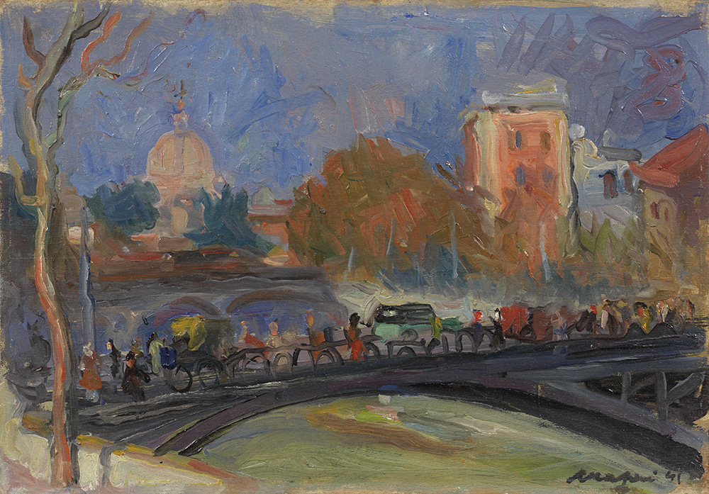 Mario Mafai, Roma 1902 - 1965, Tramonto su Roma, 1941, Olio su tavola, cm. 24x34,3; Firma e data in basso a destra: Mafai 41. Al verso sulla tavola: dichiarazione di autenticità di Giulia Mafai, Roma, 21 Giugno 1975: etichetta e due timbri Galleria Arte - "Cortina", Cortina, con indicazione Collettiva 1983: timbro Galleria d'Arte "Campaiola", Roma: Galleria d'Arte "Molino", Roma: etichetta Macarron S.A., Madrid, con n. 119843; sul telaio: etichetta Collezione Giuseppe Iannaccone / Italia 1920-1945 / Una nuova figurazione del sé / a cura di Alberto Salvadori e Rischa Paterlini / Direttore artistico / Edoardo Bonaspetti / Triennale Milano / 1 febbraio - 19 marzo 2017.; Storia, Collezione dell'Artista;, Galleria Bonaparte, Milano;, Collezione privata; Certificato su foto Archivio della Scuola Romana, Roma, 17/02/05, con n. 425/05.; Esposizioni, Aria. Premio internazionale d'arte. Decima edizione, Fabriano, Fondazione Ermanno Casoli, Spedale di Santa Maria del Buon Gesù, 7 luglio - 16 settembre 2007, cat. p. 49, illustrato a colori;, Corrente. Le parole della vita. Opere 1930-1945, Milano, Palazzo Reale, 18 giugno - 7 settembre 2008, cat. pp. 28, 88, illustrato a colori;, Collezione Giuseppe Iannaccone. Italia 1920-1945. Una nuova figurazione e il racconto del sé, a cura di Alberto Salvadori e Rischa Paterlini, Triennale di Milano, 1 febbraio - 19 marzo 2017, cat. p. 238, illustrato a colori.; Bibliografia, Alessandro Moscè, Aria, cieli e paesaggi, in L'Azione, 14 luglio 2007, cit.;, Una caccia amorosa. Arte italiana tra le due guerre nella collezione Iannaccone, Skira, Ginevra - Milano, 2009, pp. 40, 222;, Italia 1920-1945: da De Pisis a Guttuso. Da Sassu a Vedova. La collezione Giuseppe Iannaccone, Arte & Arte Grafica, Bergamo, 2017, p. 22.