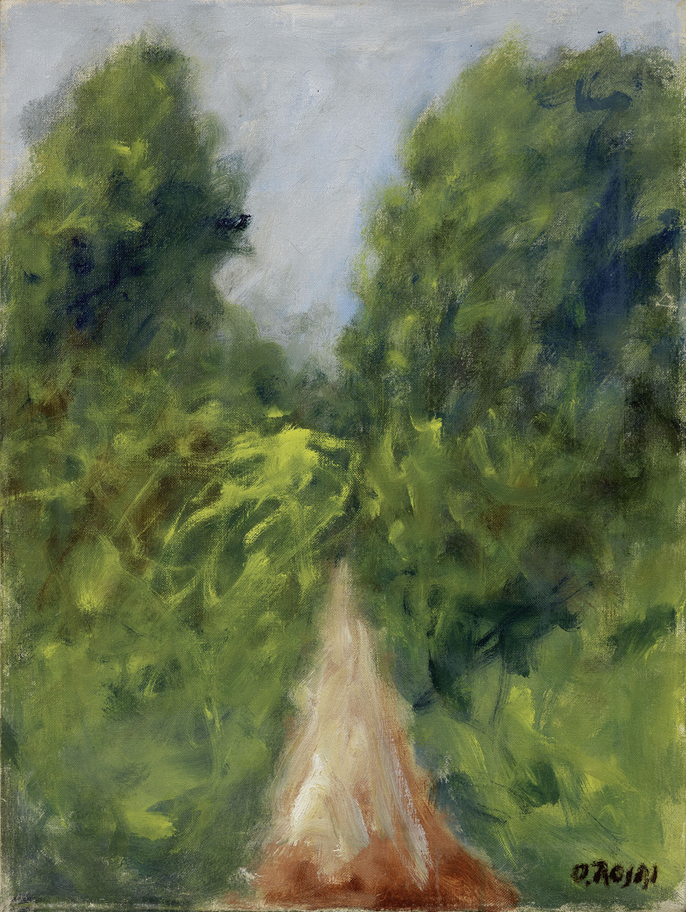 Ottone Rosai, Firenze 1895 - Ivrea (To) 1957, Stradina nel bosco, Olio su tela, cm. 60,5x45,5; Firma in basso a destra: O. Rosai. Al verso sulla tela: sigla Bruno Giraldi: etichetta con timbro e firma Raccolta Bruno Giraldi / Livorno - Firenze: etichetta Galleria d'Arte Farsetti, Prato.; Storia, Collezione privata, Sesto Fiorentino;, Collezione privata