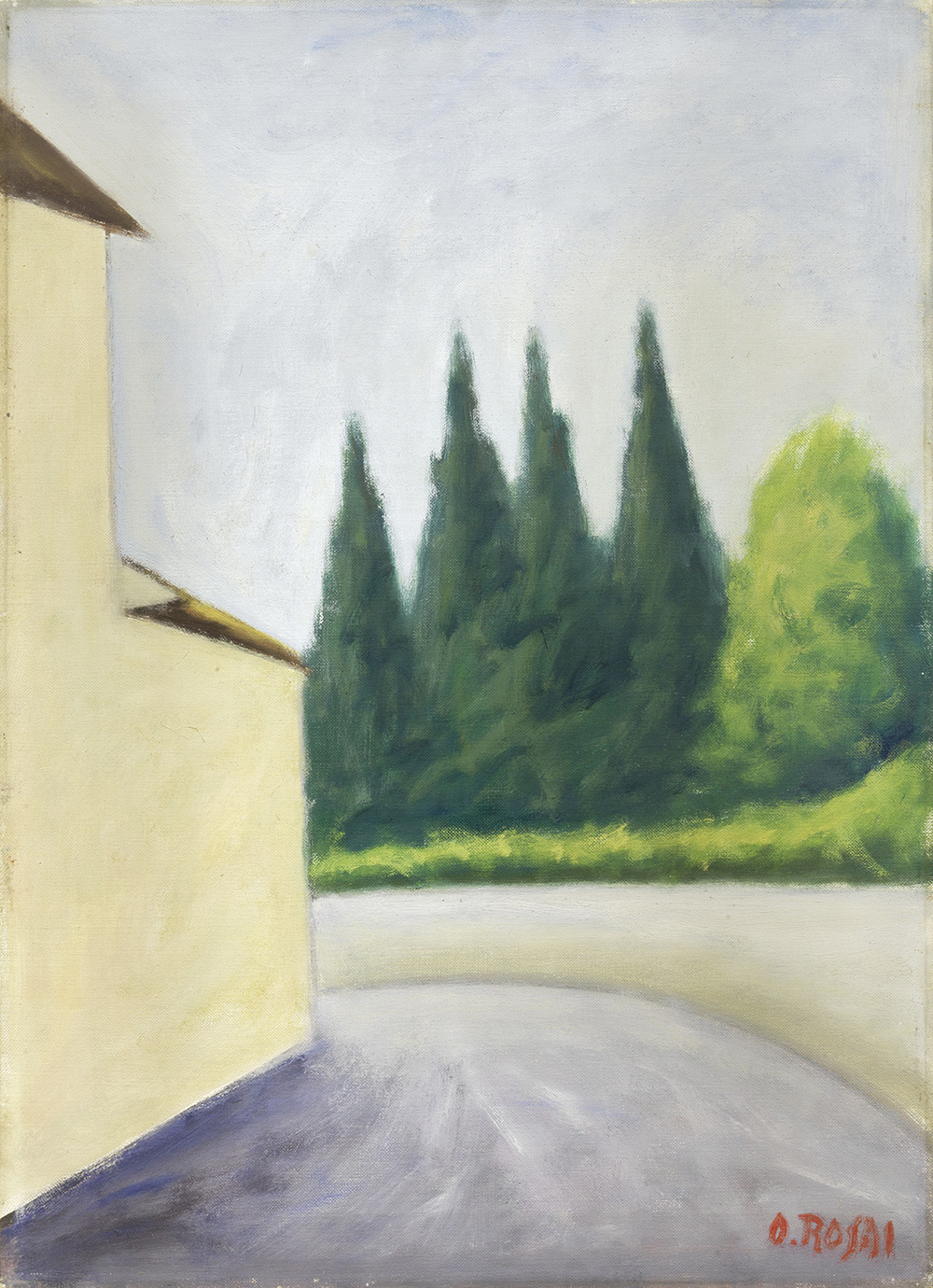 Ottone Rosai, Firenze 1895 - Ivrea (To) 1957, Strada con casa e cipressi, 1954 ca., Olio su tela, cm. 70,3x50,2; Firma in basso a destra: O. Rosai. Al verso sulla tela: timbro Galleria Bergamini, Milano, con n. 10/1055/54; sulla tela e sul telaio: sigla Bruno Giraldi.; Certificato su foto di Luigi Cavallo, Milano, 12 marzo 2019.