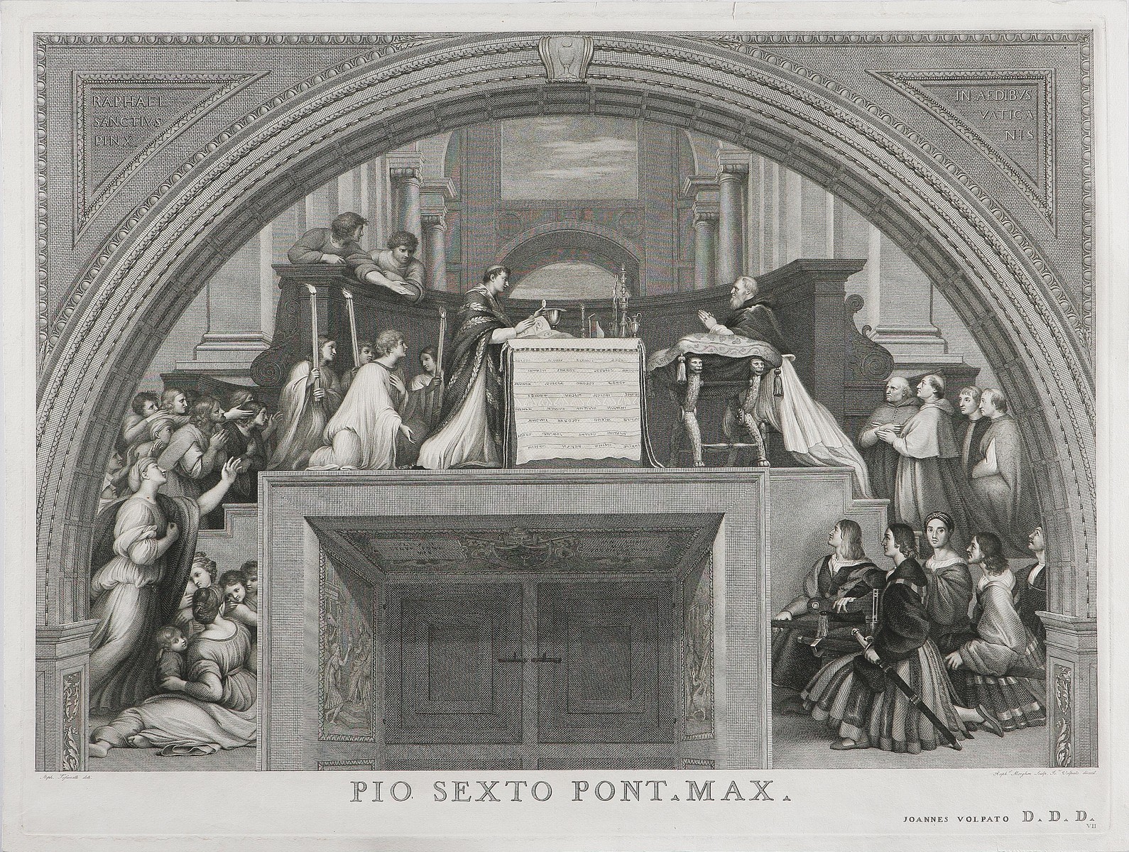 MORGHEN RAFFAELLO (1758 - 1833) La messa di Bolsena. 1784. Acquaforte e bulino. Cm 78x59,5. Incisione all’acquaforte e bulino tratta dai dipinti di Raffaello nelle Sale Vaticane e da un disegno di Stefano Tofanelli - ROMA 1782-84 - Dim. dell’intero foglio con piccoli margini L. 78 x 59,5 cm. (dim. del solo inciso senza le lettere L. 75,5 x 51,5 cm.).Bibliogr. MILESI, 233 - LE BLANC, III, 49-55 - VALLARDI, 375 - DE ANGELIS, XIV, 248-262 - PALMERINI, Opere d'intaglio del Cav. Raffaello Morghen, Firenze 1834