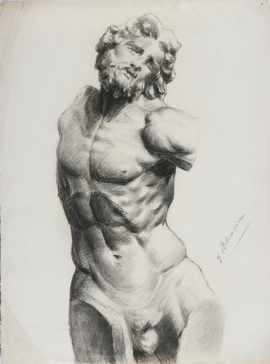 REBOURSIERE ALICE Tronco senza braccia di personaggio nudo. 1905. Carboncino su carta. Cm 48x63,5. Disegno a carboncino e matita nera su carta pesante - BABRIZON 1904-1905 - Dim. dell’intero foglio L. 48 X H. 63,5 cm.Studio accademico tipico del periodo francese della SCUOLA DI BARBIZON.