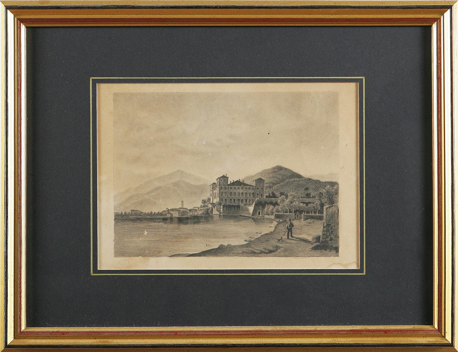 ANONIMO DEL XIX SECOLO Veduta lacustre con grande palazzo. Matita su carta....