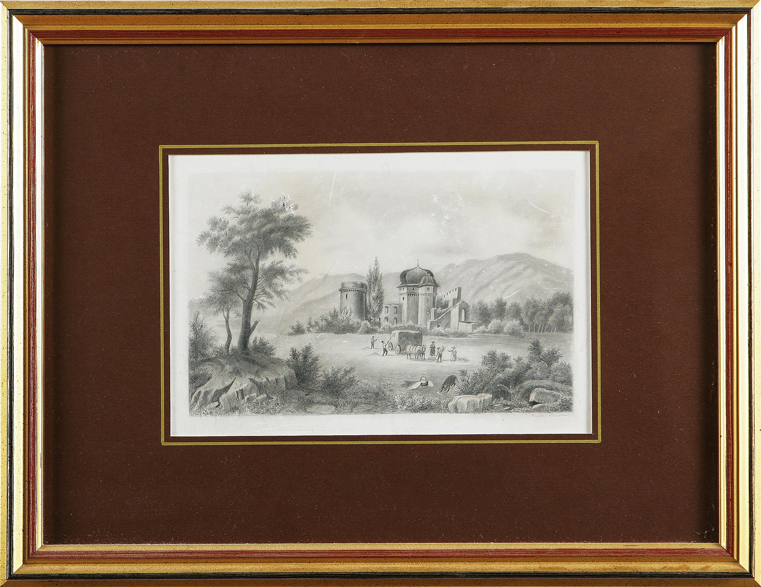 ANONIMO DEL XIX SECOLO Contadini al lavoro nei campi di fronte ad un castello. Matita su carta. Cm 25,5x17,5. Disegno a matita su carta bianca, fondo beige - Epoca seconda metà XIX° - In buone condizioni. Dim. del foglio con piccoli margini L. 25,5 X 17,5 cm. (dim. della sola parte disegnata L. 22 x 13,8 cm.). Dim. della cornice dorata con passpartout marrone: L. 44 x H. 34 cm.