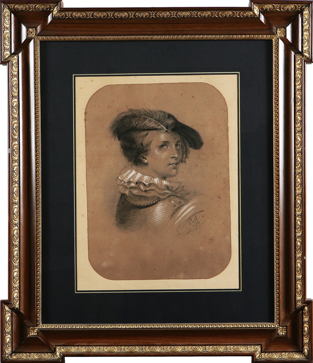 ANONIMO Giovane paggio con cappello. 1872. Carboncino e matita. Cm 29,7x40,2. Pittore francese firmato PUEL. Disegno a carboncino e matita, rifinito con biacca su cartoncino col. biscotto - Francia 1872 - Dim. del foglio del disegno con angoli arrotondati L. 29,7 x 40,2 cm. (dim. della cornice in finto legno e oro, tipicamente anni ’40: L. 64 x H. 74 cm.).