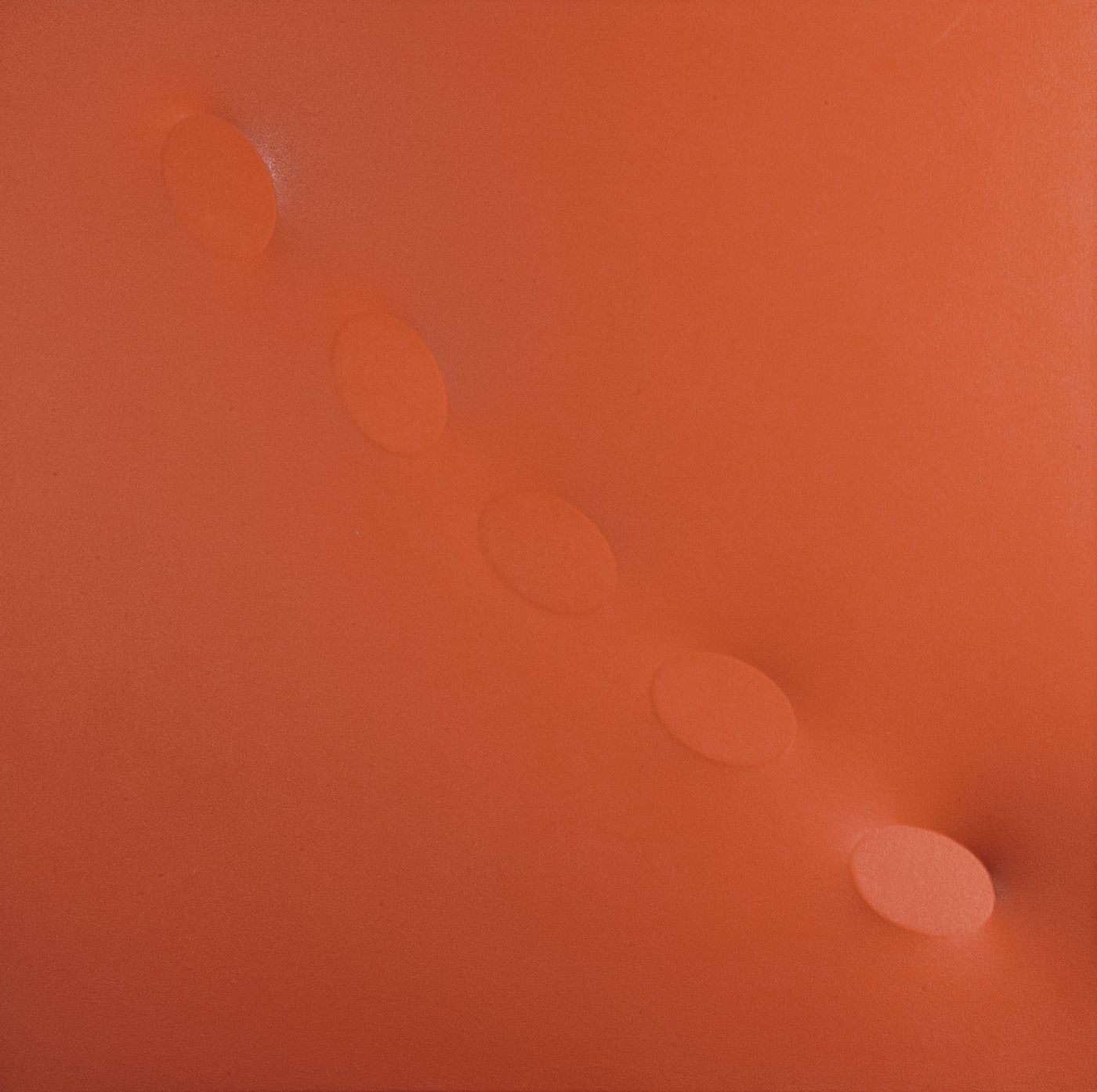 SIMETI TURI Alcamo (TP) 1929 "Cinque ovali rossi" 2003 80x80 acrilico su tela sagomata estroflessa Opera firmata e datata al retro Autentica dell'artista su fotografia rilasciata nel 2004 Opera archiviata presso l'Archivio Generale di Turi Simeti con il n. 003727
