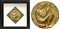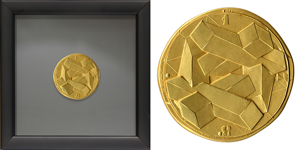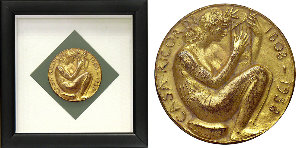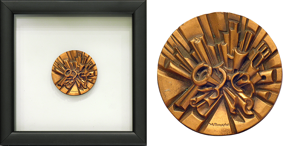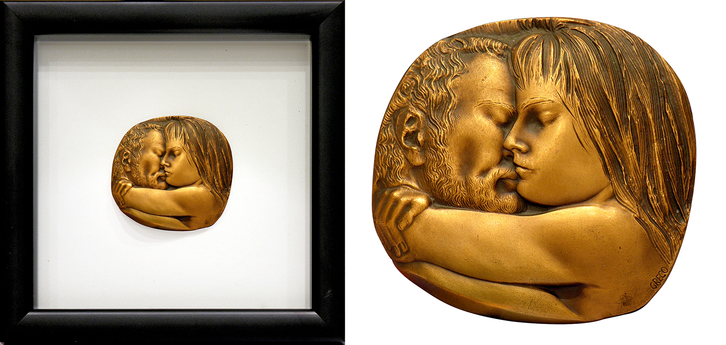 GIO' POMODORO COGEFAR 1959-1979 bassorilevo in bronzo su base in travertino, h cm 14 firmato GIO' POMODORO COMPOSIZIONE bassorilevo in bronzo dorato, entro teca, diametro cm 7 UMBERTO MASTROIANNI COMPOSIZIONE bassorilevo in bronzo, entro teca, diametro cm 8 firmato FRANCESCO MESSINA CASA RICORDI 1808.1958 bassorilevo in bronzo, entro teca, diametro cm 8 firmato EMILIO GRECO BACIO bassorilevo in bronzo, entro teca, diametro cm 8 firmato (5)
